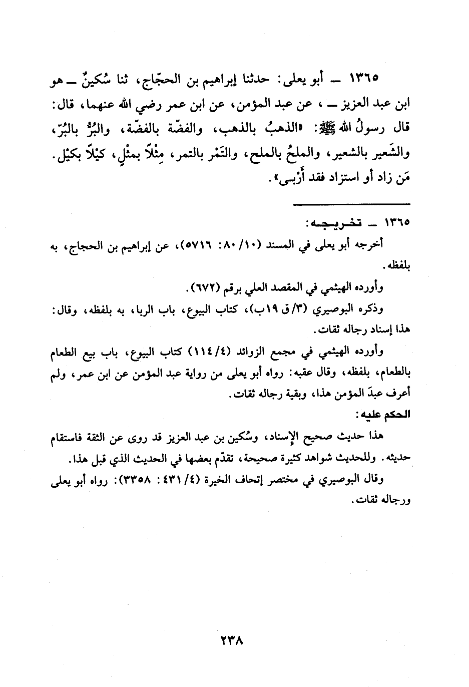 1365 - أَبُو يَعْلَى حَدَّثَنَا إِبْرَاهِيمُ بْنُ الحجاج ثنا سكين هُوَ ابْنُ عَبْدِ الْعَزِيزِ عَنْ عَبْدِ الْمُؤْمِنِ عَنِ ابن عمر رَضِيَ الله عَنْهما قَالَ قَالَ رَسُولُ اللَّهِ صَلَّى اللَّهُ عَلَيْهِ وَسَلَّمَ §الذَّهَبُ بِالذَّهَبِ وَالْفِضَّةُ بِالْفِضَّةِ وَالْبُرُّ بِالْبُرِّ وَالشَّعِيرُ بِالشَّعِيرِ وَالْمِلْحُ بِالْمِلْحِ وَالتَّمْرُ بِالتَّمْرِ مِثْلًا بِمِثْلٍ كَيْلًا بِكَيْلٍ مَنْ زَادَ أَوِ اسْتَزَادَ فَقَدْ أَرْبَى
