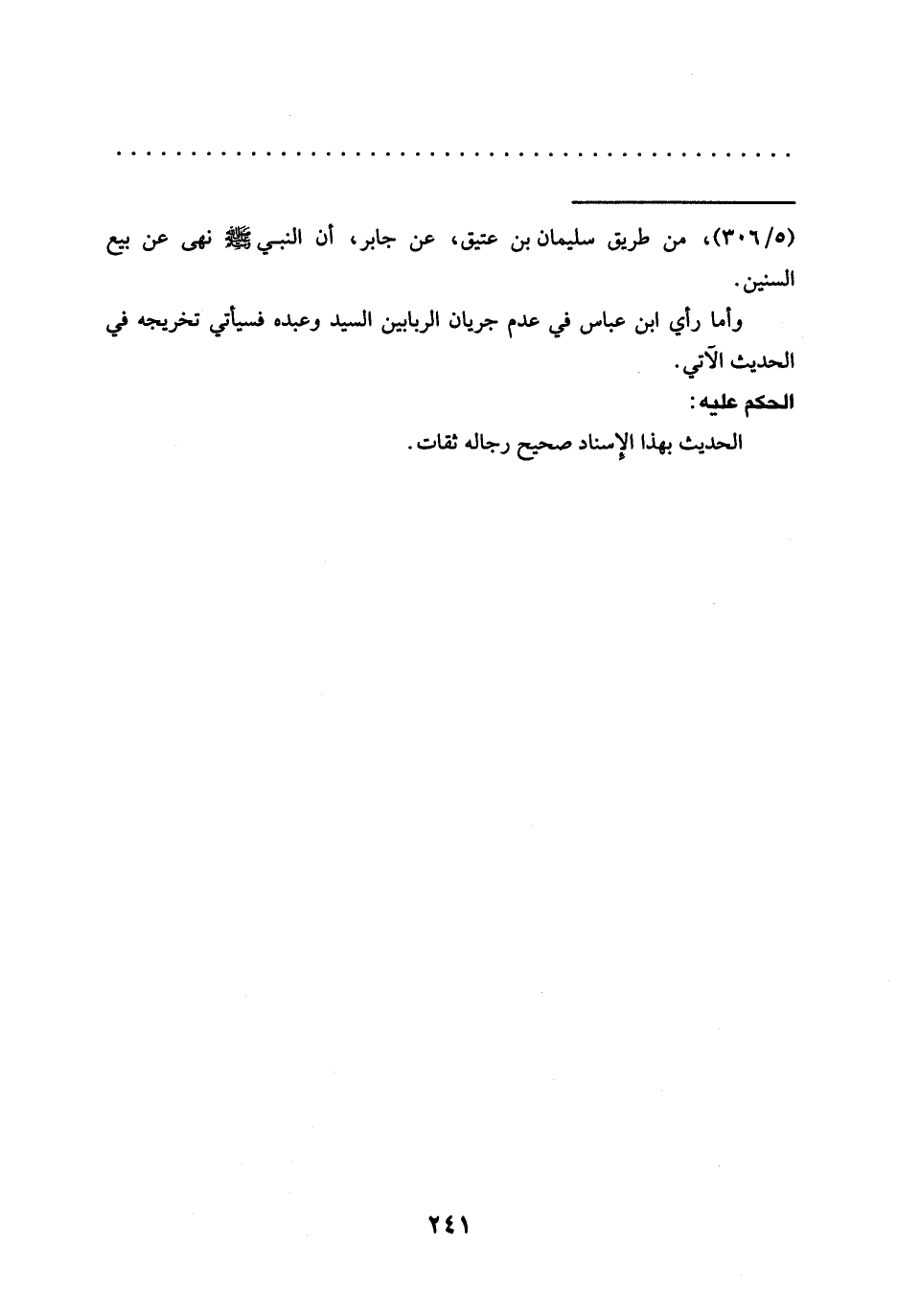 = (5/ 306) , من طريق سليمان بن عَتِيقٍ، عَنْ جَابِرٍ، أَنَّ النَّبِيَّ -صَلَّى اللَّهُ عَلَيْهِ وسلم- نهى عن بيع السنين.