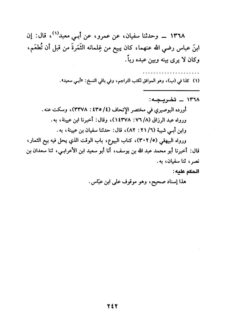 1368 - وَحَدَّثَنَا سُفْيَانُ عَنْ عَمْرٍو عن أبي معبد قال أَنَّ ابن عباس رَضِيَ الله عَنْهما §كَانَ يبيع من غلمانه الثَّمَرَةَ مِنْ قبل أن تطعم وَكَانَ لَا يَرَى بَيْنَهُ وَبَيْنَ عَبْدِهِ رِبًا