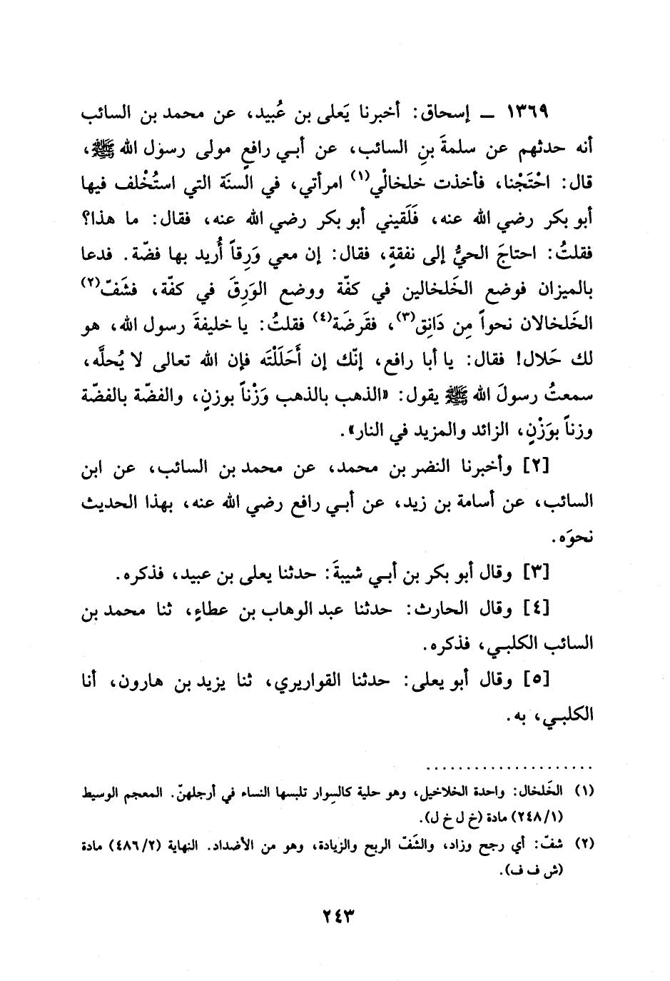 1369 - إِسْحَاقُ أَخْبَرَنَا يَعْلَى بْنُ عُبَيْدٍ عَنْ مُحَمَّدِ بْنِ السَّائِبِ أَنَّهُ حَدَّثَهُمْ عَنْ سَلَمَةَ بْنِ السَّائِبِ عَنْ أَبِي رَافِعٍ مَوْلَى رَسُولِ اللَّهِ صَلَّى اللَّهُ عَلَيْهِ وَسَلَّمَ قَالَ احْتَجْنَا فَأَخَذْتُ خُلْخَالَيِّ امْرَأَتِي فِي السَّنَةِ الَّتِي اسْتَخُلِفَ فِيهَا أَبُو بَكْرٍ رَضِيَ الله عَنْه فليقني أبو بكر رَضِيَ الله عَنْه فَقَالَ مَا هَذَا فَقُلْتُ احْتَاجَ الْحَيُّ إِلَى نَفَقَةٍ فَقَالَ إِنَّ مَعِي وَرِقًا أُرِيدُ بِهَا فِضَّةً فَدَعَا بِالْمِيزَانِ فَوَضَعَ الْخُلْخَالَيْنِ فِي كِفَّةٍ وَوَضَعَ الْوَرِقَ فِي كِفَّةٍ فَشَفُّ الْخُلْخَالَانِ نَحْوًا مِنْ دَانِقٍ فَقَرَضَهُ فَقُلْتُ يَا خَلِيفَةَ رَسُولِ اللَّهِ هُوَ لَكَ حَلَالٌ فَقَالَ يَا أَبَا رَافِعٍ إِنَّكَ إِنْ أحللته فإن الله تعالى لَا يُحِلُّهُ سَمِعْتُ رَسُولَ اللَّهِ صَلَّى اللَّهُ عَلَيْهِ وَسَلَّمَ يَقُولُ §الذَّهَبُ بِالذَّهَبِ وَزْنًا بِوَزْنٍ وَالْفِضَّةُ بِالْفِضَّةِ وَزْنًا بِوَزْنٍ الزَّائِدُ وَالْمَزِيدُ فِي النَّارِ