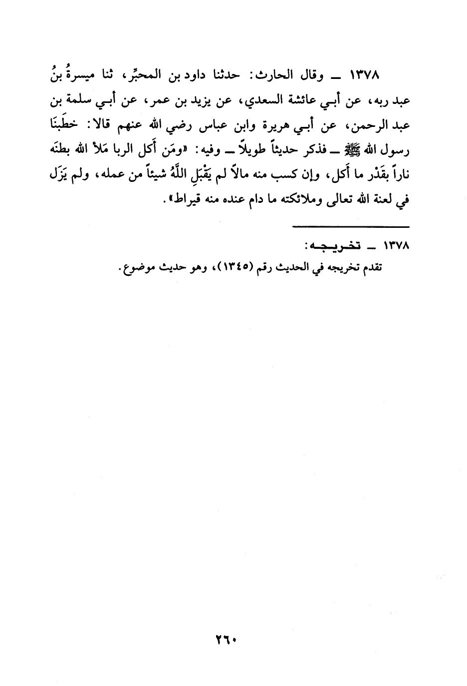 1378 - وَقَالَ الْحَارِثُ حَدَّثَنَا دَاوُدُ بْنُ الْمُحَبَّرِ ثنا مَيْسَرَةُ بْنُ عَبْدِ رَبِّهِ عَنْ أَبِي عَائِشَةَ السَّعْدِيِّ عَنْ يزيد بن عمر عَنْ أَبِي سَلَمَةَ بْنِ عَبْدِ الرَّحْمَنِ عَنْ أَبِي هُرَيْرَةَ وابن عباس رَضِيَ الله عَنْهم قَالَا خَطَبَنَا رَسُولُ اللَّهِ صَلَّى اللَّهُ عَلَيْهِ وَسَلَّمَ فَذَكَرَ حَدِيثًا طَوِيلًا وَفِيهِ §وَمَنْ أَكَلَ الرِّبَا مَلَأَ اللَّهُ بَطْنَهُ نَارًا بِقَدْرِ مَا أَكَلَ وَإِنْ كَسَبَ مِنْهُ مَالًا لَمْ يَقْبَلِ اللَّهُ شَيْئًا مِنْ عَمَلِهِ وَلَمْ يَزَلْ فِي لعنة الله تعالى وَمَلَائِكَتِهِ ما دام عنده مِنْهُ قِيرَاطٌ
