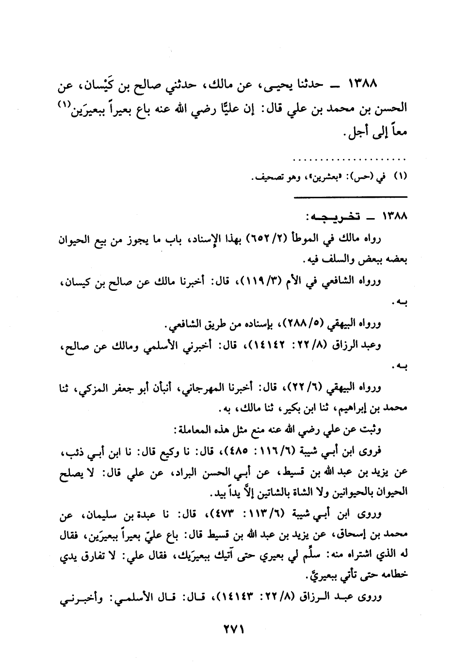 1388 - حَدَّثَنَا يَحْيَى عَنْ مَالِكٍ حَدَّثَنِي صَالِحُ بْنُ كَيْسَانَ عَنِ الْحَسَنِ بْنِ مُحَمَّدِ بْنِ علي قال إن عليا رَضِيَ الله عَنْه §بَاعَ بَعِيرًا بِبَعِيرَيْنِ مَعًا إِلَى أجا