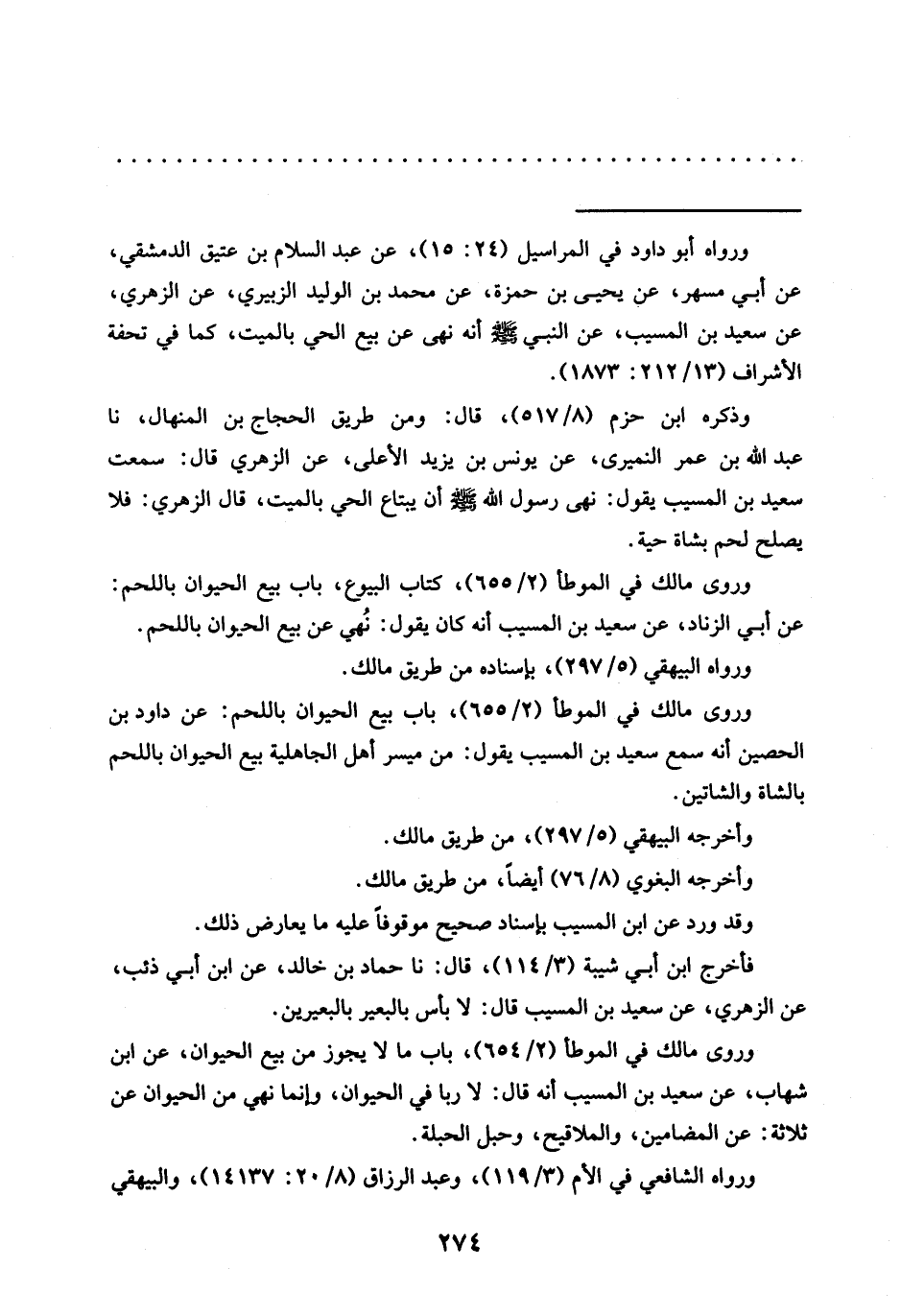 = ورواه أبو داود في المراسيل (24: 15)، عن عبد السلام بن عتيق الدمشقي، عن أبي مسهر، عن يحيى بن حمزة، عن محمد بن الوليد الزبيري، عَنِ الزُّهْرِيِّ، عَنْ سَعِيدِ بْنِ الْمُسَيِّبِ، عَنْ النَّبِيِّ -صَلَّى اللَّهُ عَلَيْهِ وَسَلَّمَ- أَنَّهُ نَهَى عن بيع الحي بالميت، كما في تحفة الأشراف (13/ 212: 1873).