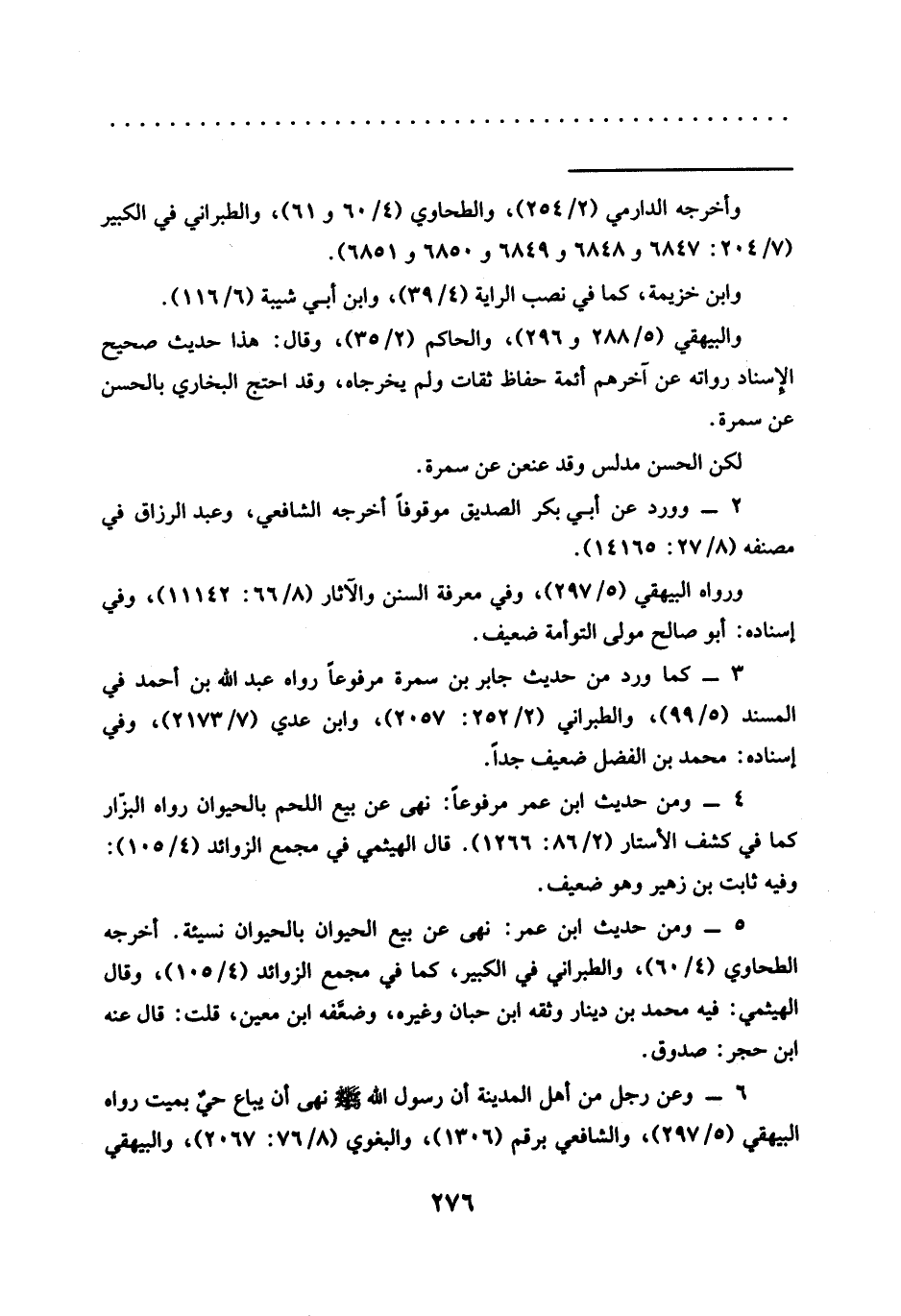 4 - ومن حديث ابن عمر مرفوعًا: نهى عن بيع اللحم بالحيوان رواه البزّار كما في كشف الأستار (2/ 86: 1266). قال الهيثمي في مجمع الزوائد (4/ 105): وفيه ثابت بن زهير وهو ضعيف.