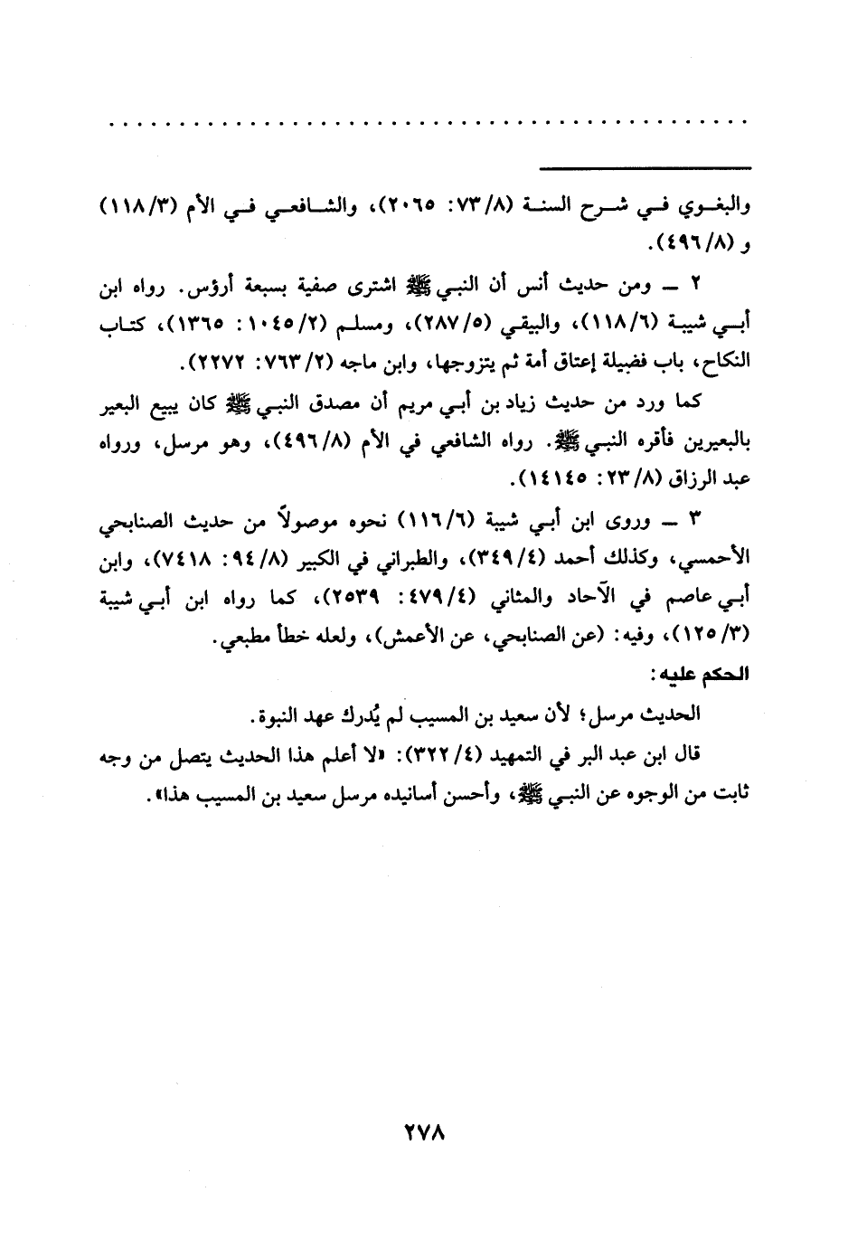 قال ابن عبد البر في التمهيد (4/ 322): "لا أعلم هذا الحديث يتصل من وجه ثابت من الوجوه عن النبي - صلي الله عليه وسلم-، وأحسن أسانيده مرسل سعيد بن المسيب هذا".