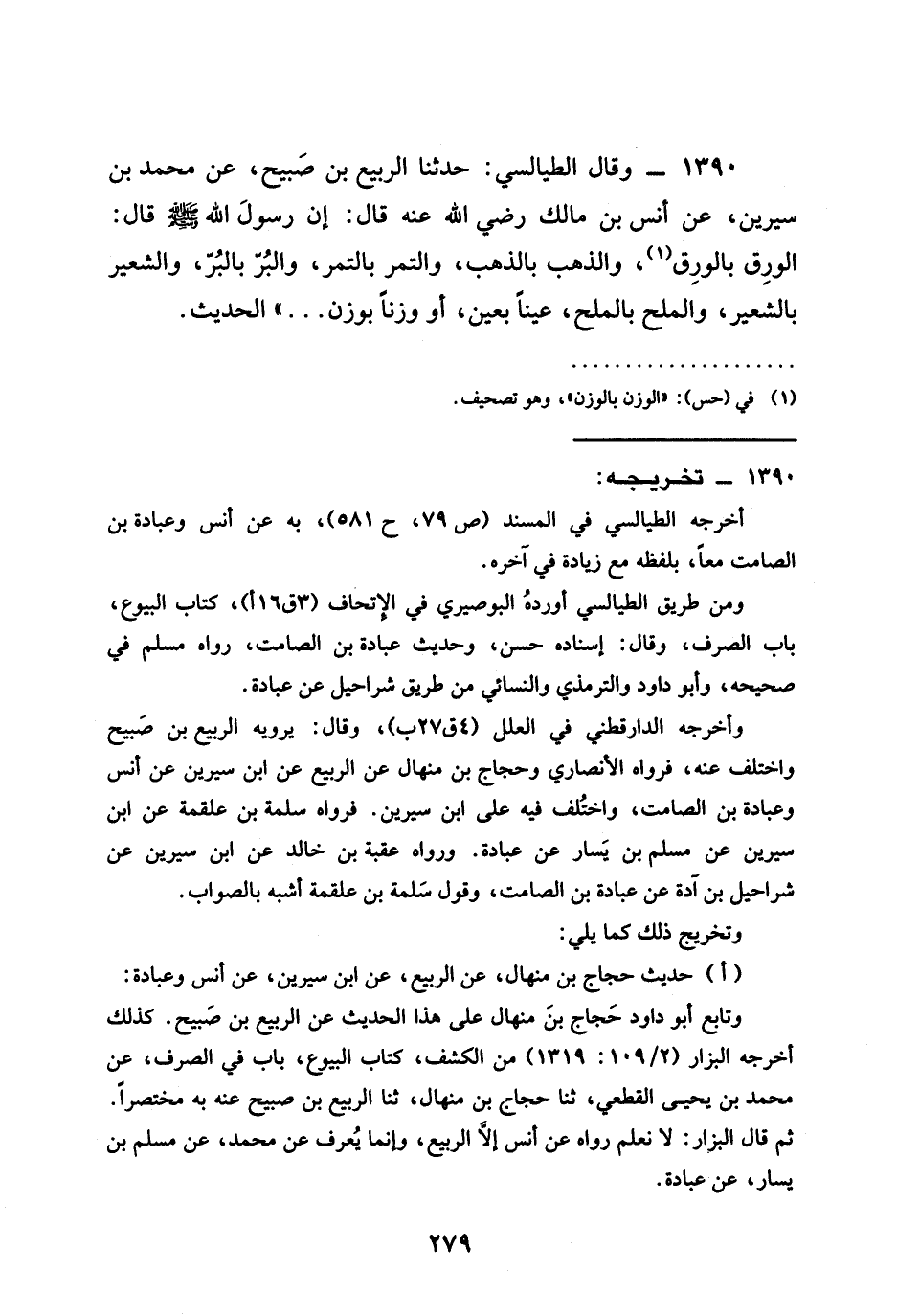 1390 - وَقَالَ الطَّيَالِسِيُّ، حَدَّثَنَا الرَّبِيعُ بْنُ صبيح، عَنْ مُحَمَّدِ بْنِ سِيرِينَ، عَنْ أَنَسِ بْنِ مَالِكٍ رضي الله عنه: أَنَّ رَسُولَ اللَّهِ صَلَّى اللَّهُ عَلَيْهِ وَسَلَّمَ قَالَ: " §الْوَرِقُ بِالْوَرِقِ، وَالذَّهَبُ بِالذَّهَبِ، وَالتَّمْرُ بِالتَّمْرِ، وَالْبُرُّ بِالْبُرِّ، وَالشَّعِيرُ بِالشَّعِيرِ، وَالْمِلْحُ بِالْمِلْحِ، عَيْنًا بِعَيْنٍ، أَوْ وَزْنًا بِوَزْنٍ " الْحَدِيثَ