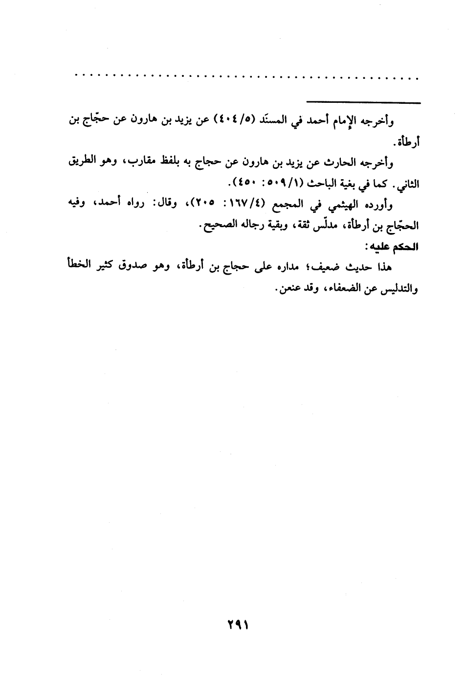 وأورده الهيثمي في المجمع (4/ 167: 205)، وقال: رواه أحمد، وفيه الحجّاج بن أرطاة، مدلّس ثقة، وبقية رجاله الصحيح.