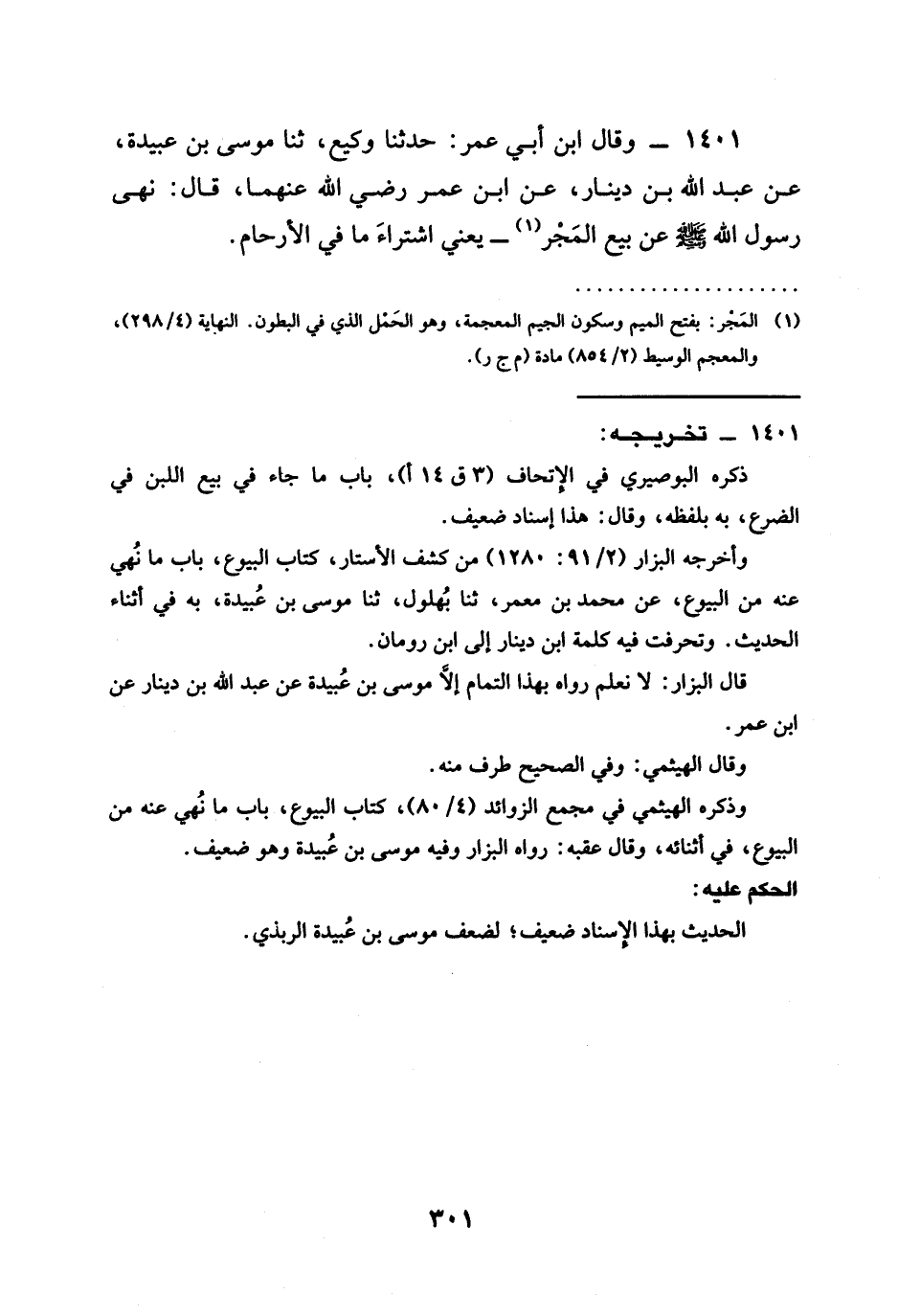 1401 - وَقَالَ ابْنُ أَبِي عُمَرَ حَدَّثَنَا وَكِيعٌ ثنا مُوسَى بْنُ عُبَيْدَةَ عَنْ عَبْدِ اللَّهِ بْنِ دِينَارٍ عَنِ ابن عمر رَضِيَ الله عَنْهما قَالَ §نَهَى رَسُولُ اللَّهِ صَلَّى اللَّهُ عَلَيْهِ وَسَلَّمَ عَنْ بَيْعِ الْمَجَرِ يَعْنِي اشْتِرَاءَ مَا فِي الْأَرْحَامِ