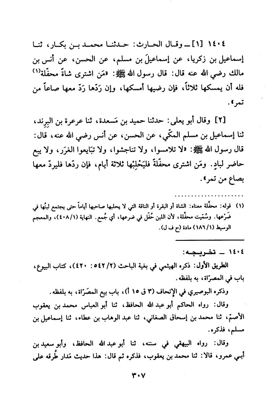 1404-[1] وَقَالَ الْحَارِثُ حَدَّثَنَا مُحَمَّدُ بْنُ بَكَّارٍ ثنا إِسْمَاعِيلُ بْنُ زَكَرِيَّا عَنْ إِسْمَاعِيلَ بْنِ مُسْلِمٍ عَنِ الْحَسَنِ عَنْ أَنَسِ بن مالك رَضِيَ الله عَنْه قَالَ قَالَ رَسُولُ اللَّهِ صَلَّى اللَّهُ عَلَيْهِ وَسَلَّمَ §من اشْتَرَى شَاةً مُحَفَّلَةً فَلَهُ أَنْ يُمْسِكَهَا ثَلَاثًا فَإِنْ رَضِيَهَا أَمْسَكَهَا وَإِنْ رَدَّهَا مَعَهَا صَاعًا مِنْ تَمْرٍ
