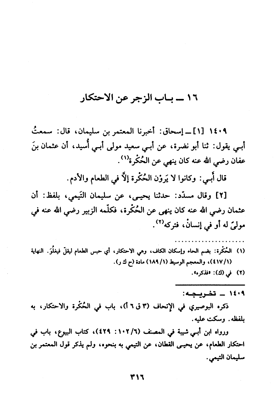 1409 -[1] إِسْحَاقُ أَخْبَرَنَا الْمُعْتَمِرُ بن سليمان قال سَمِعْتُ أَبِي يَقُولُ ثنا أَبُو نَضْرَةَ عَنْ أَبِي سَعِيدٍ مَوْلَى أَبِي أُسَيْدٍ أَنَّ عُثْمَانَ بن عفان رَضِيَ الله عَنْه §كَانَ يَنْهَى عَنِ الحكرة قال أبي وكانوا لا يرون الحكرة إلا في الطعام والأدم