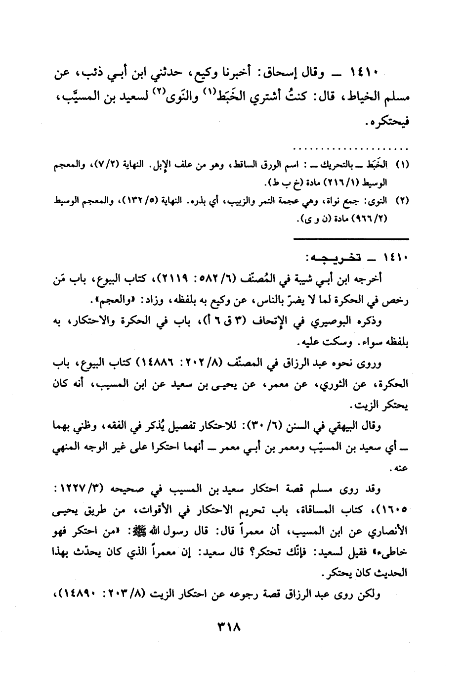 1410 - وَقَالَ إِسْحَاقُ أَخْبَرَنَا وَكِيعٌ حَدَّثَنِي ابْنُ أَبِي ذِئْبٍ عَنْ مُسْلِمٍ الخياط قَالَ كُنْتُ §أَشْتَرِي الْخَبَطَ وَالنَّوَى لِسَعِيدِ بْنِ الْمُسَيِّبِ فَيَحْتَكِرُهُ