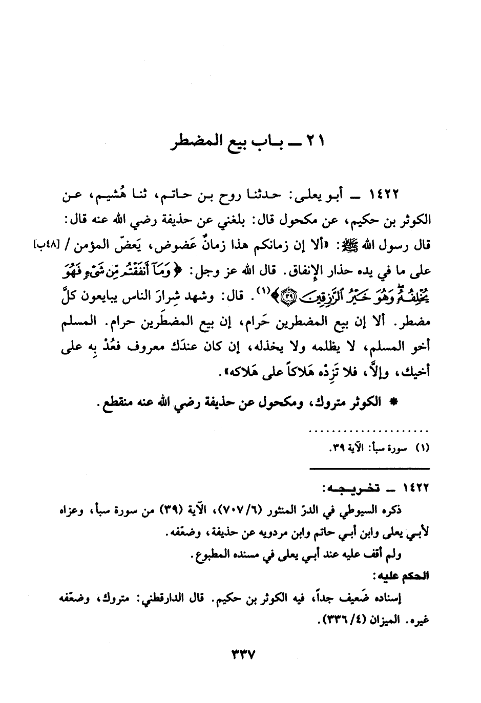1422 - أَبُو يَعْلَى حَدَّثَنَا رَوْحُ بْنُ حَاتِمٍ ثنا هُشَيْمٌ عَنِ الْكَوْثَرِ بْنِ حَكِيمٍ عَنْ مكحول قال بلغني عن حذيفة رَضِيَ الله عَنْه قَالَ قَالَ رَسُولُ اللَّهِ صَلَّى اللَّهُ عَلَيْهِ وَسَلَّمَ أَلَا إِنَّ زَمَانَكُمْ هَذَا زَمَانٌ عَضُوضٌ يَعَضُّ الْمُؤْمِنُ عَلَى مَا في يده حذار الْإِنْفَاقِ قَالَ اللَّهُ عَزَّ وَجَلَّ {وَمَا أَنْفَقْتُمْ مِنْ شَيْءٍ فَهُوَ يُخْلِفُهُ وَهُوَ خَيْرُ الرَّازِقِينَ} قَالَ وَشَهِدَ شِرَارُ النَّاسِ يُبَايِعُونَ كُلَّ مُضْطَرٍّ أَلَا إِنَّ بَيْعَ الْمُضْطَرِّينَ حَرَامٌ إِنَّ بَيْعَ الْمُضْطَرِّينَ حَرَامٌ §الْمُسْلِمُ أَخُو الْمُسْلِمِ لَا يَظْلِمُهُ وَلَا يَخْذُلُهُ إِنْ كَانَ عِنْدَكَ مَعْرُوفٌ فَعُدْ بِهِ عَلَى أَخِيكَ وَإِلَّا فَلَا تزده هلاكا على هَلَاكِهِ