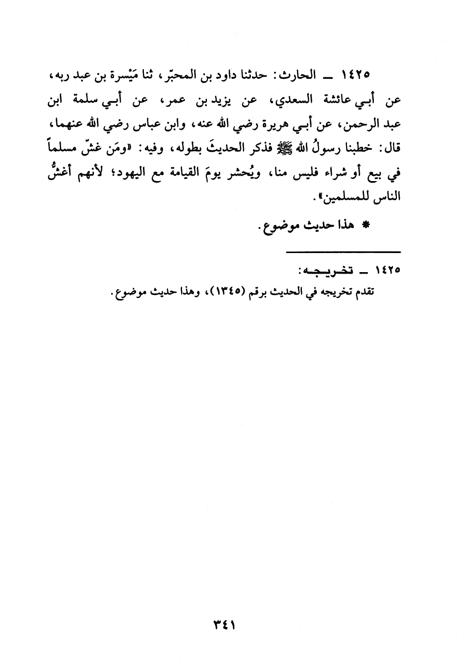 1425 - الْحَارِثُ حَدَّثَنَا دَاوُدُ بْنُ الْمُحَبَّرِ ثنا مَيْسَرَةُ بْنُ عَبْدِ رَبِّهِ عَنْ أَبِي عَائِشَةَ السَّعْدِيِّ عَنْ يزيد بن عمر عَنْ أَبِي سَلَمَةَ ابن عَبْدِ الرَّحْمَنِ عَنْ أَبِي هُرَيْرَةَ رَضِيَ الله عَنْه وَابْنِ عَبَّاسٍ رَضِيَ الله عَنْهما قال خَطَبَنَا رَسُولُ اللَّهِ صَلَّى اللَّهُ عَلَيْهِ وَسَلَّمَ فَذَكَرَ الْحَدِيثَ بِطُولِهِ وَفِيهِ §وَمَنْ غَشَّ مُسْلِمًا فِي بَيْعٍ أَوْ شِرَاءٍ فَلَيْسَ مِنَّا وَيُحْشَرُ يَوْمَ الْقِيَامَةِ مَعَ الْيَهُودِ لِأَنَّهُمْ أَغَشُّ النَّاسِ لِلْمُسْلِمِينَ