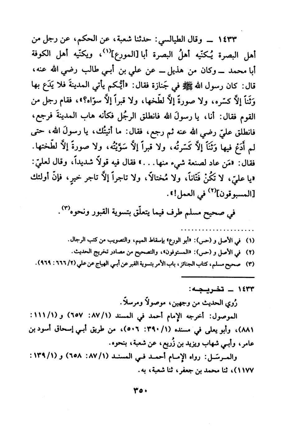1433 - وقال الطَّيَالِسِيُّ حدثنا شُعْبَةُ عَنِ الْحَكَمِ عَنْ رَجُلٍ مِنْ أَهْلِ الْبَصْرَةِ يُكَنِّيهِ أَهْلِ الْبَصْرَةِ أَبَا الْمُوَرِّعِ وَيُكَنِّيهِ أَهْلُ الْكُوفَةِ أَبَا مُحَمَّدٍ وَكَانَ مِنْ هُذَيْلٍ عَنْ عَلِيِّ بْنِ أبي طالب رَضِيَ الله عَنْه قَالَ كَانَ رَسُولُ اللَّهِ صَلَّى اللَّهُ عَلَيْهِ وَسَلَّمَ فِي جَنَازَةٍ فَقَالَ §أَيُّكُمْ يَأْتِي الْمَدِينَةَ فَلَا يَدَعْ بِهَا وَثَنًا إِلَّا كَسَرَهُ وَلَا صُورَةً إِلَّا لَطَّخَهَا وَلَا قَبْرًا إِلَّا سَوَّاهُ فَقَامَ رَجُلٌ مِنَ الْقَوْمِ فَقَالَ أَنَا يَا رَسُولُ اللَّهِ فَانْطَلَقَ الرَّجُلُ فَكَأَنَّهُ هَابَ الْمَدِينَةَ فَرَجَعَ فانطلق علي رَضِيَ الله عَنْه ثُمَّ رَجَعَ فَقَالَ مَا أَتَيْتُكَ يَا رَسُولَ اللَّهِ حَتَّى لَمْ أَدَعْ فِيهَا وَثَنًا إِلَّا كَسَرْتُهُ وَلَا قَبْرًا إِلَّا سَوَّيْتُهُ وَلَا صُورَةً إِلَّا لَطَّخْتُهَا فَقَالَ مَنْ عَادَ لِصَنْعَةِ شَيْءٍ مِنْهَا فَقَالَ فِيهِ قَوْلًا شَدِيدًا وَقَالَ لِعَلِيٍّ يَا عَلِيُّ لَا تَكُنُ فتانا ولا مختالا وَلَا تَاجِرًا إِلَّا تَاجِرَ خَيْرٍ فَإِنَّ أوليك المسبوقون فِي العمل في صحيح مسلم طَرَفٌ فِيمَا يَتَعَلَّقُ بِتَسْوِيَةِ الْقُبُورِ وَنَحْوِهِ
