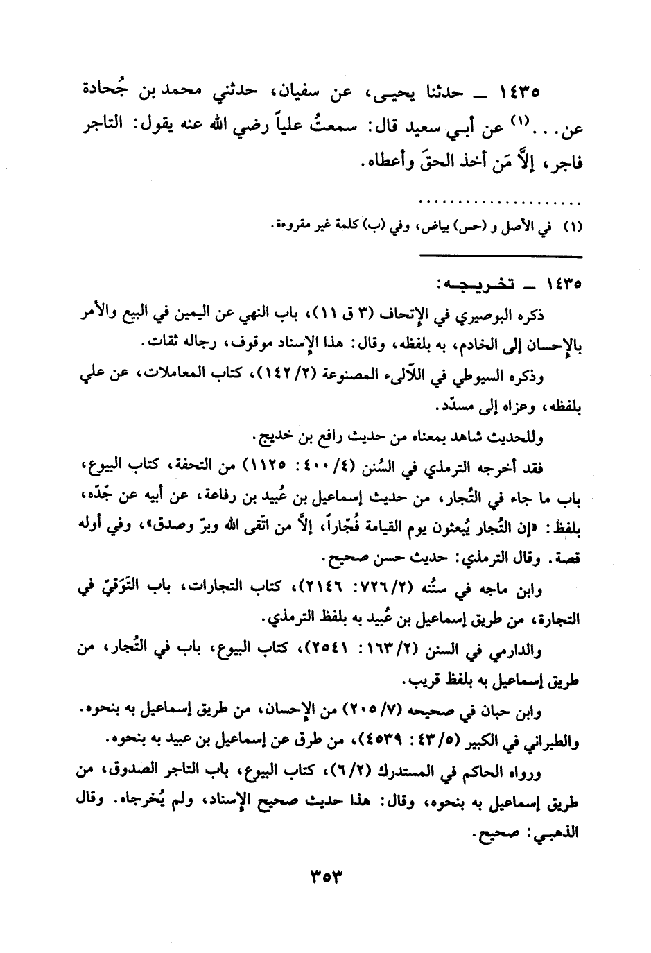 1435 - حدثنا يَحْيَى عَنْ سُفْيَانَ حدثني محمد بن حجادة عن عَنْ أبي سعيد قال سمعت عليا رَضِيَ الله عَنْه يَقُولُ §التَّاجِرُ فَاجِرٌ إِلَّا من أخذ الحق وَأَعْطَاهُ