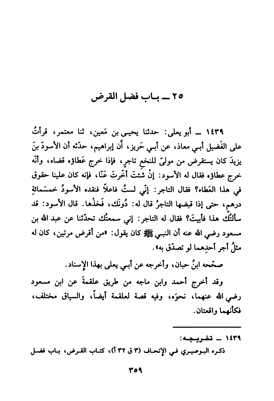 1439 - أَبُو يَعْلَى حَدَّثَنَا يَحْيَى بْنُ مَعِينٍ ثنا مُعْتَمِرٌ قَرَأْتُ عَلَى الفضل أَبِي مُعَاذٍ عَنْ أَبِي حَرِيزٍ أَنَّ إِبْرَاهِيمَ حَدَّثَهُ أَنَّ الْأَسْوَدَ بْنَ يَزِيدَ كَانَ يَسْتَقْرِضُ مِنْ مَوْلًى لِلنَّخْعِ تَاجِرٍ فَإِذَا خَرَجَ عَطَاؤُهُ قَضَاهُ وَأَنَّهُ خَرَجَ عَطَاؤُهُ فَقَالَ لَهُ الْأَسْوَدُ إِنْ شِئْتَ أَخَّرْتَ عَنَّا فَإِنَّ كَانَ عَلَيْنَا حُقُوقٌ فِي هَذَا الْعَطَاءِ فَقَالَ التَّاجِرُ إِنِّي لَسْتُ فَاعِلًا فَنَقَدَهُ الْأَسْوَدُ خَمْسَمِائَةَ دِرْهَمٍ حَتَّى إِذَا قَبَضَهَا التاجر قال لي دُونَكَ فَخُذْهَا قَالَ الْأَسْوَدُ قَدْ سَأَلْتُكَ هَذَا فَأَبَيْتَ فَقَالَ لَهُ التَّاجِرُ إِنِّي سَمِعْتُكَ تُحَدِّثُنَا عَنْ عَبْدِ اللَّهِ بن مسعود رَضِيَ الله عَنْه أَنَّ النَّبِيَّ صَلَّى اللَّهُ عَلَيْهِ وَسَلَّمَ كَانَ يَقُولُ §مَنْ أَقْرَضَ مَرَّتَيْنِ كَانَ لَهُ مِثْلُ أَجْرِ أَحَدِهِمَا لَوْ تَصَدَّقَ بِهِ صَحَّحَهُ ابْنُ حِبَّانَ وَأَخْرَجَهُ عَنْ أَبِي يَعْلَى بِهَذَا الْإِسْنَادِ وَقَدْ أَخْرَجَ أَحْمَدُ وَابْنُ مَاجَةَ مِنْ طَرِيقِ عَلْقَمَةَ عَنِ ابن مسعود رَضِيَ الله عَنْهما نَحْوَهُ وَفِيهِ قِصَّةٌ لِعَلْقَمَةَ أَيْضًا وَالسِّيَاقُ مُخْتَلِفٌ فَكَأَنَّهُمَا وَاقِعَتَانِ
