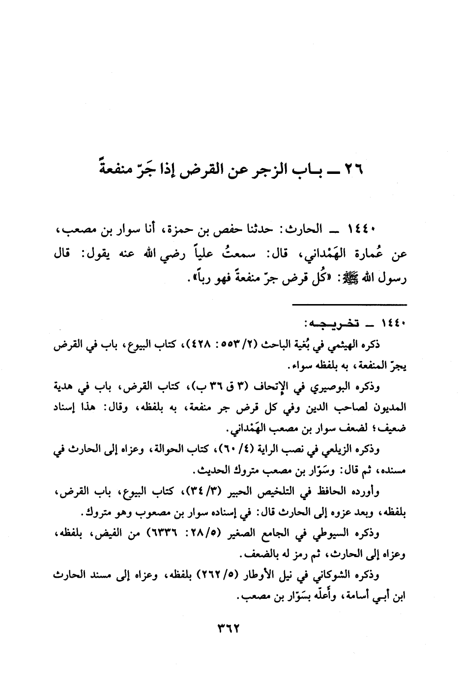 1440 - الْحَارِثُ حَدَّثَنَا حَفْصُ بْنُ حَمْزَةَ أنا سَوَّارُ بْنُ مُصْعَبٍ عَنْ عُمَارَةَ الهمداني قال سمعت عليا رَضِيَ الله عَنْه يَقُولُ قَالَ رَسُولُ اللَّهِ صَلَّى اللَّهُ عَلَيْهِ وَسَلَّمَ §كُلُّ قَرْضٍ جَرَّ مَنْفَعَةً فَهُوَ رِبًا