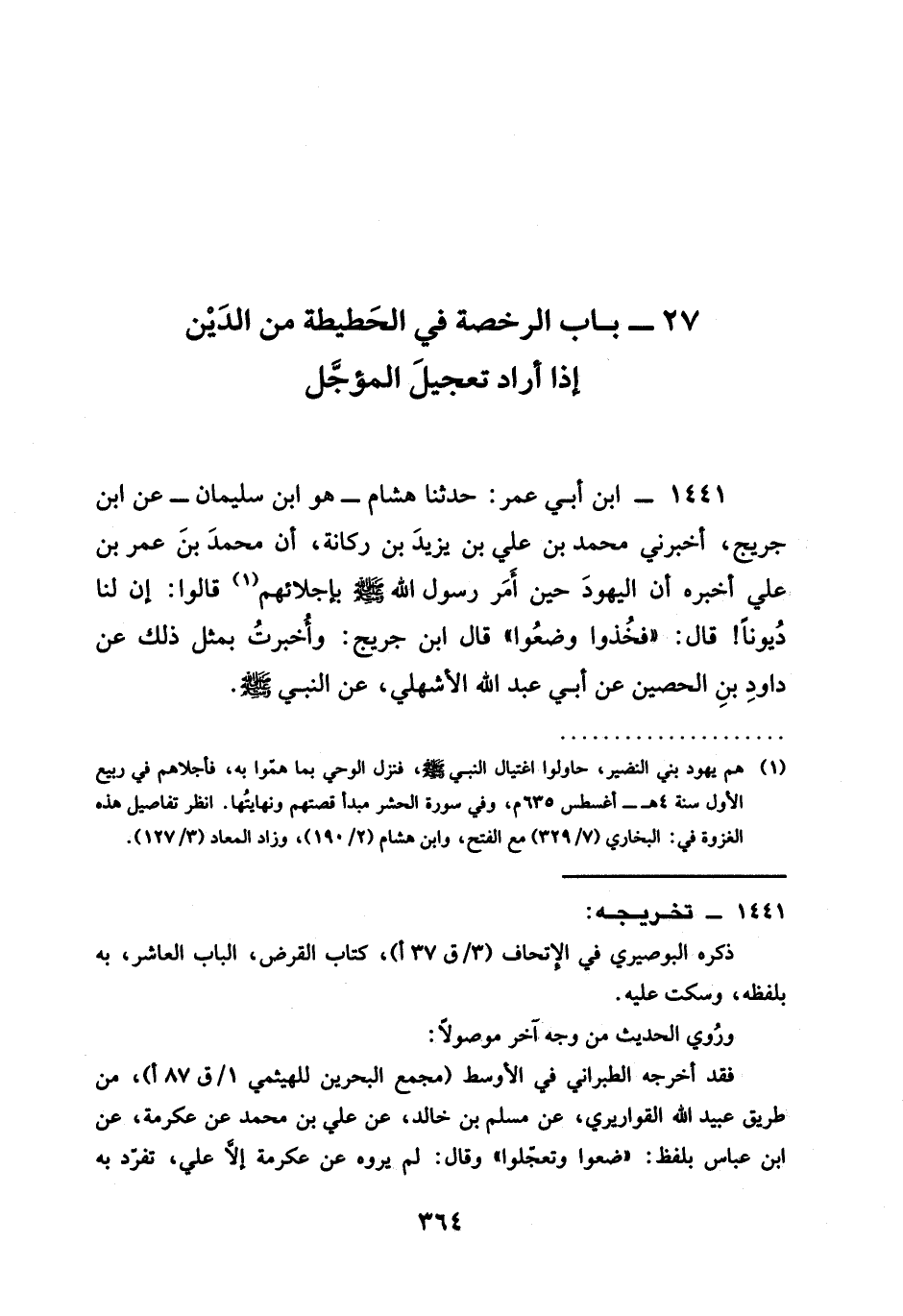 1441 - ابْنُ أَبِي عُمَرَ حدثنا هشام هو ابن سُلَيْمَانَ عَنِ ابْنِ جُرَيْجٍ أَخْبَرَنِي مُحَمَّدُ بْنُ عَلِيِّ بْنِ يَزِيدَ بْنِ رُكَانَةَ أَنَّ مُحَمَّدَ بْنَ عُمَرَ بْنِ عَلِيٍّ أَخْبَرَهُ أَنَّ الْيَهُودَ §حِينَ أَمَرَ رَسُولُ اللَّهِ صَلَّى اللَّهُ عَلَيْهِ وَسَلَّمَ بِإِجْلَائِهِمْ قَالُوا إِنَّ لَنَا دُيُونًا قَالَ فَخُذُوا وَضَعُوا قَالَ ابْنُ جُرَيْجٍ وَأُخْبِرْتُ بِمِثْلِ ذَلِكَ عَنْ دَاوُدَ بْنِ الحصين عن أبي عبد الله الأشهلي عَنِ النَّبِيِّ صَلَّى اللَّهُ عَلَيْهِ وَسَلَّمَ