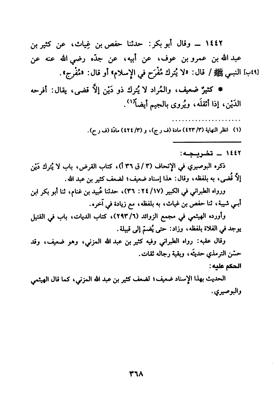 1442 - وقال أَبُو بَكْرٍ حدثنا حَفْصُ بْنُ غِيَاثٍ عَنْ كَثِيرِ بْنِ عَبْدِ اللَّهِ بْنِ عَمْرِو بْنِ عَوْفٍ عَنْ أَبِيهِ عن جده رَضِيَ الله عَنْه عَنْ النَّبِيِّ صَلَّى اللَّهُ عَلَيْهِ وَسَلَّمَ قَالَ §لَا يُتْرَكُ مُفْرِحٌ فِي الْإِسْلَامِ أَوْ قَالَ مُفَرِّجٌ