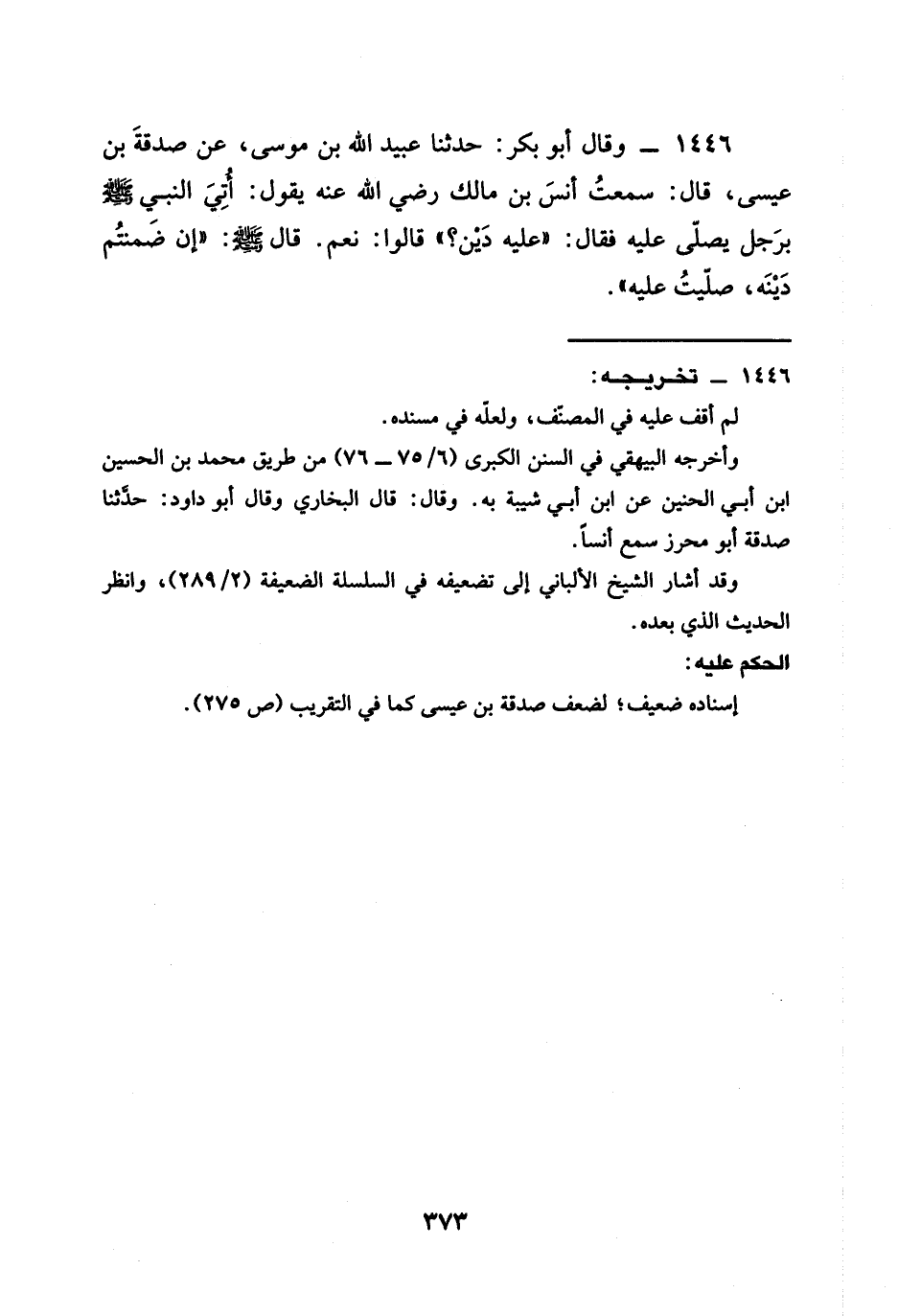 1446 - وَقَالَ أَبُو بَكْرِ حَدَّثَنَا عُبَيْدُ اللَّهِ بْنُ مُوسَى عَنْ صَدَقَةَ بن عيسى قال سَمِعْتُ أَنَسَ بن مالك رَضِيَ الله عَنْه يقول أُتِيَ النَّبِيُّ صَلَّى اللَّهُ عَلَيْهِ وَسَلَّمَ بِرَجُلٍ يُصَلِّي عَلَيْهِ فَقَالَ عَلَيْهِ دَيْنٌ قَالُوا نَعَمْ قَالَ صَلَّى اللَّهُ عَلَيْهِ وَسَلَّمَ §إِنْ ضَمِنْتُمْ دَيْنَهُ صَلَّيْتُ عَلَيْهِ