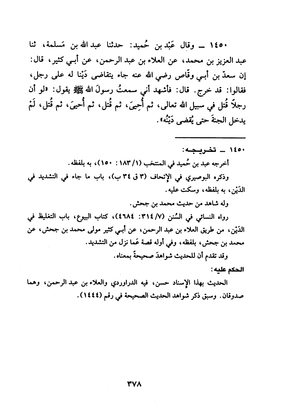 1450 - وَقَالَ عَبْدُ بْنُ حُمَيْدٍ حدثنا عَبْدُ اللَّهِ بْنُ مَسْلَمَةَ ثنا عَبْدُ الْعَزِيزِ بْنُ مُحَمَّدٍ عَنِ الْعَلَاءِ بْنِ عَبْدِ الرَّحْمَنِ عَنْ أبي كثير قال أَنَّ سَعْدَ بْنَ أبي وقاص رَضِيَ الله عَنْه جَاءَ يَتَقَاضَى دَيْنًا لَهُ عَلَى رَجُلٍ فَقَالُوا قَدْ خَرَجَ قَالَ فَأَشْهَدُ أَنِّي سَمِعْتُ رَسُولَ اللَّهِ صَلَّى اللَّهُ عَلَيْهِ وَسَلَّمَ يَقُولُ §لَوْ أَنَّ رَجُلًا قُتِلَ فِي سبيل الله تعالى ثُمَّ أُحْيِيَ ثُمَّ قَتَلَ ثُمَّ أُحْيِيَ ثُمَّ قَتَلَ لَمْ يَدْخُلِ الْجَنَّةَ حَتَّى يُقْضَى دَيْنُهُ