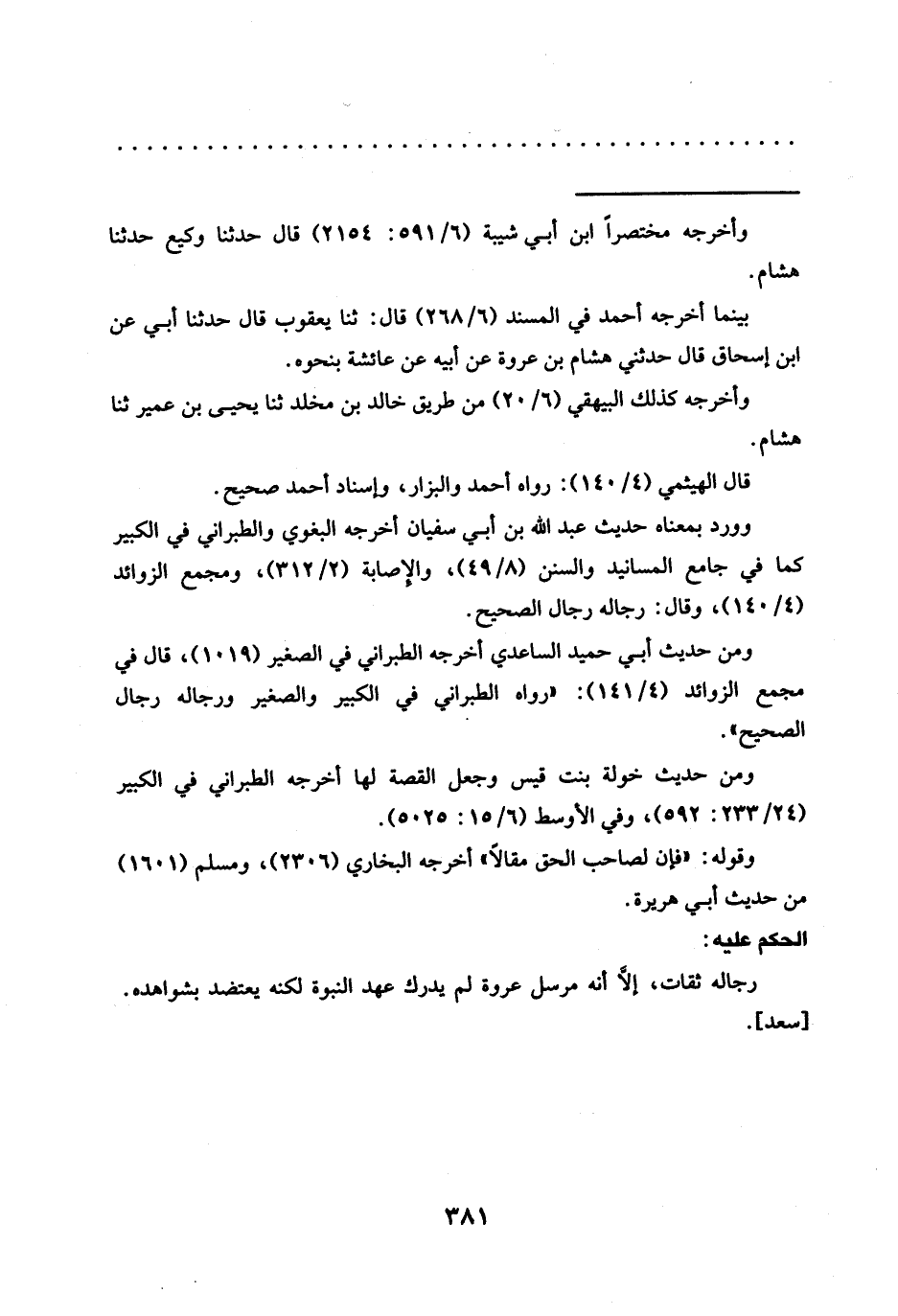 رجاله ثقات، إلَّا أنه مرسل عروة لم يدرك عهد النبوة لكنه يعتضد بشواهده. [سعد].