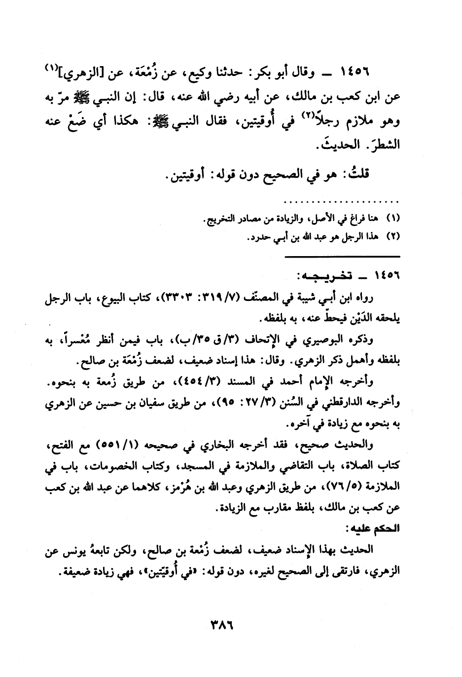 1456 - وَقَالَ أَبُو بَكْرٍ حدثنا وَكِيعٌ عَنْ زمعة عن الزهري عَنِ ابْنِ كَعْبِ بْنِ مَالِكٍ عن أبيه رَضِيَ الله عَنْه قال أَنَّ النَّبِيَّ صَلَّى اللَّهُ عَلَيْهِ وَسَلَّمَ مَرَّ بِهِ وَهُوَ مُلَازِمٌ رَجُلًا فِي أُوقِيَّتَيْنِ فَقَالَ النَّبِيُّ صَلَّى اللَّهُ عَلَيْهِ وَسَلَّمَ هَكَذَا أَيْ §ضَعْ عَنْهُ الشَّطْرَ الْحَدِيثَ قُلْتُ هُوَ فِي الصَّحِيحِ دُونَ قَوْلِهِ أُوقِيَّتَيْنِ