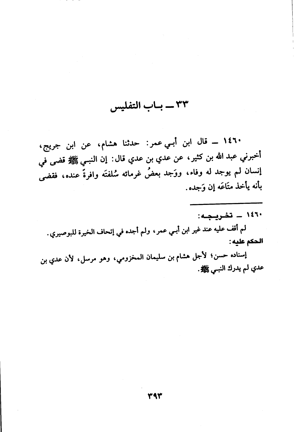 1460 - قَالَ ابْنُ أَبِي عُمَرَ حَدَّثَنَا هِشَامٌ عَنِ ابْنِ جُرَيْجٍ أَخْبَرَنِي عَبْدُ اللَّهِ بْنُ كَثِيرٍ عَنْ عَدِيِّ بن عدي قال أَنَّ النَّبِيَّ صَلَّى اللَّهُ عَلَيْهِ وَسَلَّمَ §قَضَى فِي إِنْسَانٍ لَمْ يوجد له الوفاء ووجد غرمائه سلفته وافرة عنده فقضى بأنه مَتَاعَهُ إِنْ وَجَدَهُ