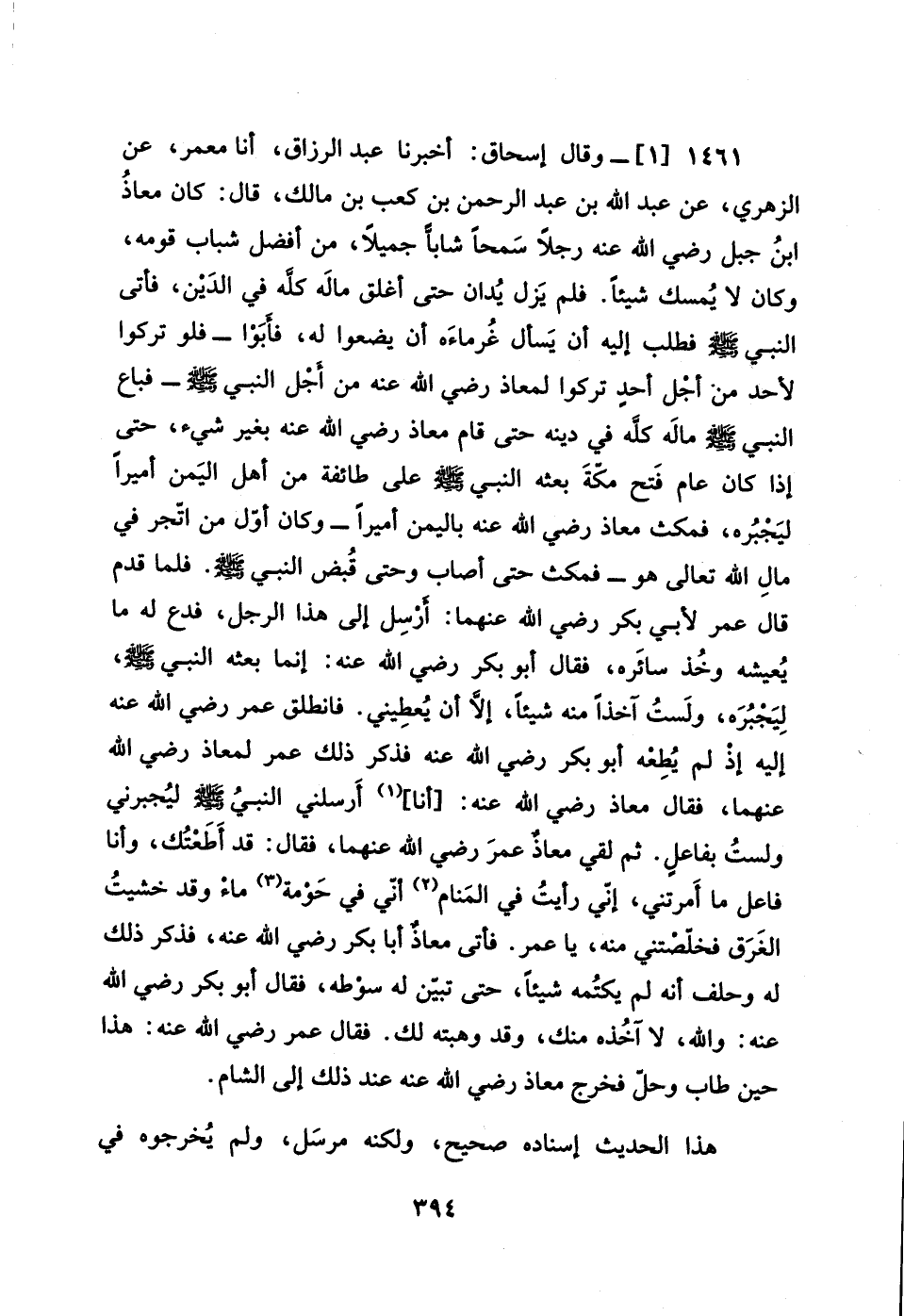 1461 -[1] وَقَالَ إِسْحَاقُ أَخْبَرَنَا عَبْدُ الرَّزَّاقِ أنا مَعْمَرٌ عَنِ الزُّهْرِيِّ عَنْ عَبْدِ اللَّهِ بْنِ عَبْدِ الرَّحْمَنِ بْنِ كَعْبِ بْنِ مَالِكٍ قَالَ كَانَ مُعَاذُ ابن جبل رَضِيَ الله عَنْه رَجُلًا سَمْحًا شَابًّا جَمِيلًا مِنْ أَفْضَلِ شَبَابِ قَوْمِهِ وَكَانَ لَا يُمْسِكُ شَيْئًا فَلَمْ يَزَلْ يُدَانُ حَتَّى أُغْلِقَ مَالُهُ كُلُّهُ فِي الدَّيْنِ فأتى النبي صَلَّى اللَّهُ عَلَيْهِ وَسَلَّمَ فطلب إِلَيْهِ أَنْ يَسْأَلَ غُرَمَاءَهُ أَنْ يَضَعُوا لَهُ فَأَبَوْا فَلَوْ تَرَكُوا لِأَحَدٍ مِنْ أَجْلِ أَحَدٍ تركوا لمعاذ رَضِيَ الله عَنْه مِنْ أَجْلِ النَّبِيِّ صَلَّى اللَّهُ عَلَيْهِ وَسَلَّمَ §فَبَاعَ النَّبِيُّ صَلَّى اللَّهُ عَلَيْهِ وَسَلَّمَ مَالَهُ كُلَّهُ فِي دَيْنِهِ حَتَّى قام معاذ رَضِيَ الله عَنْه بِغَيْرِ شَيْءٍ حَتَّى إِذَا كَانَ عَامُ فَتْحِ مَكَّةَ بَعَثَهُ النَّبِيُّ صَلَّى اللَّهُ عَلَيْهِ وَسَلَّمَ عَلَى طَائِفَةٍ مِنْ أَهْلِ الْيَمَنِ أَمِيرًا لِيَجْبُرَهُ فمكث معاذ رَضِيَ الله عَنْه بِالْيَمَنِ أَمِيرًا وَكَانَ أَوَّلَ مَنِ اتَّجَرَ فِي مال الله تعالى هُوَ فَمَكَثَ حَتَّى أَصَابَ وَحَتَّى قُبِضَ النَّبِيُّ صَلَّى اللَّهُ عَلَيْهِ وَسَلَّمَ فَلَمَّا قَدِمَ قَالَ عُمَرُ لأبي بكر رَضِيَ الله عَنْهما أَرْسِلْ إِلَيَّ هذا الرجل فدع لَهُ مَا يُعَيِّشُهُ وَخُذْ سَائِرَهُ فَقَالَ أبو بكر رَضِيَ الله عَنْه إِنَّمَا بَعَثَهُ النبي صَلَّى اللَّهُ عَلَيْهِ وَسَلَّمَ ليجبره ولست آخِذًا مِنْهُ شَيْئًا إِلَّا أَنْ يُعْطِيَنِي فانطلق عمر رَضِيَ الله عَنْه إِلَيْهِ إِذْ لَمْ يُطِعْهُ أبو بكر رضي الله عنه فَذَكَرَ ذَلِكَ عُمَرُ لِمُعَاذٍ رَضِيَ الله عَنْهما فقال معاذ رَضِيَ الله عَنْه إِنَّمَا أَرْسَلَنِي النَّبِيُّ صَلَّى اللَّهُ عَلَيْهِ وَسَلَّمَ ليجبرني وَلَسْتُ بِفَاعِلٍ ثُمَّ لَقِيَ مُعَاذٌ عُمَرَ رَضِيَ الله عَنْهما فَقَالَ قَدْ أَطَعْتُكَ وَأَنَا فَاعِلٌ مَا أَمَرْتَنِي إِنِّي رَأَيْتُ فِي الْمَنَامِ أَنِّي فِي حَوْمَةِ مَاءٍ وَقَدْ خَشِيتُ الْغَرَقَ فَخَلَّصْتَنِي مِنْهُ يَا عُمَرُ فَأَتَى مُعَاذٌ أبا بكر رَضِيَ الله عَنْه فَذَكَرَ ذَلِكَ لَهُ وَحَلَفَ أَنَّهُ لَمْ يَكْتُمْهُ شيئا حتى تبين لَهُ سَوْطَهُ فَقَالَ أَبُو بَكْرٍ رَضِيَ الله عَنْه وَاللَّهِ لَا آخُذُهُ مِنْكَ وَقَدْ وَهَبْتُهُ لَكَ فَقَالَ عُمَرُ رَضِيَ الله عَنْه هَذَا حِينَ طَابَ وَحَلَّ فَخَرَجَ مُعَاذٌ رَضِيَ الله عَنْه عِنْدَ ذَلِكَ إِلَى الشَّامِ هَذَا الْحَدِيثُ