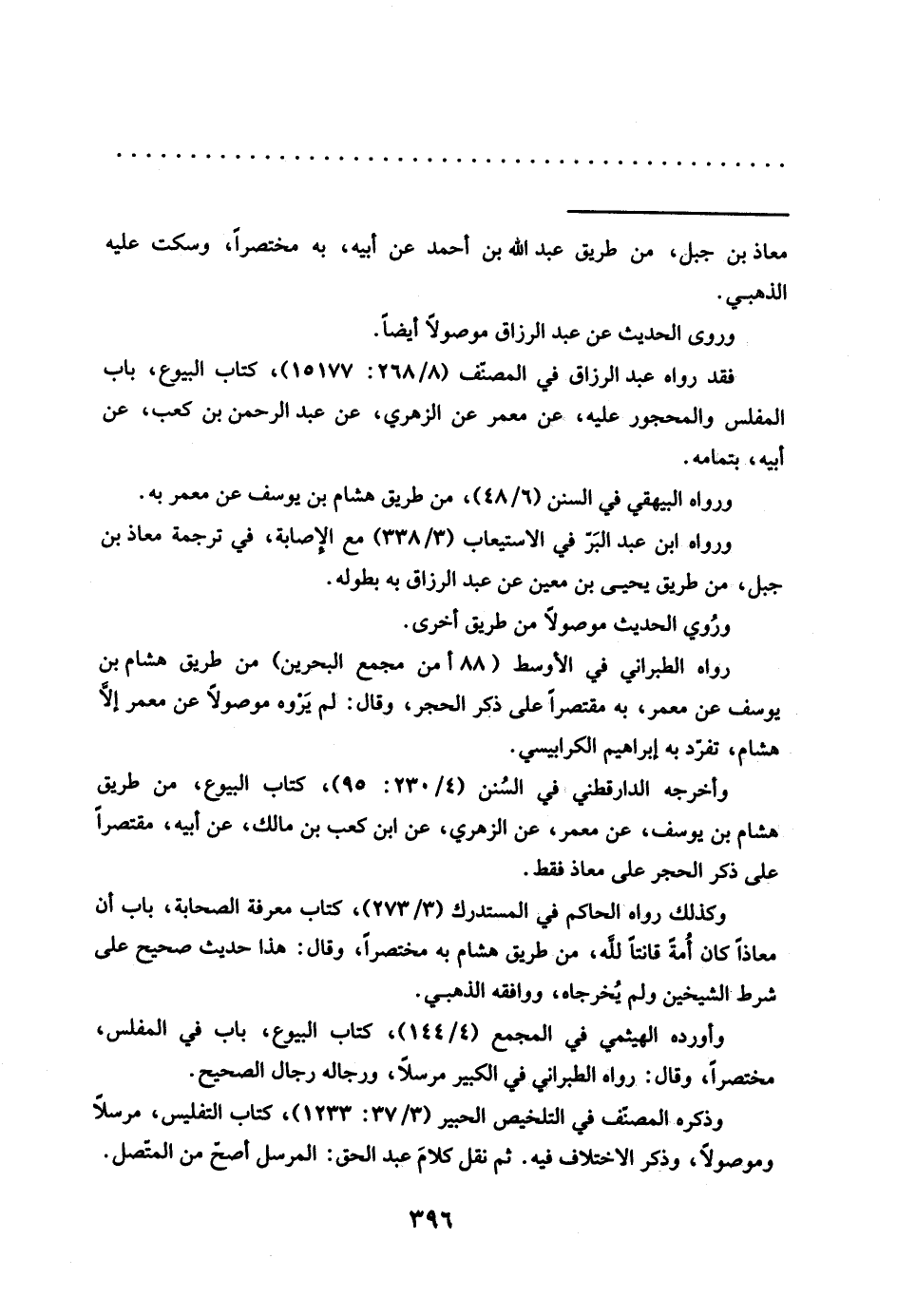وأخرجه الدارقطني في السُنن (4/ 230: 95)، كتاب البيوع، من طريق هشام بن يوسف , عن مَعْمَرٌ، عَنِ الزُّهْرِيِّ، عَنِ ابْنِ كَعْبِ بْنِ مالك، عن أبيه، مقتصرًا على ذكر الحجر على معاذ فقط.