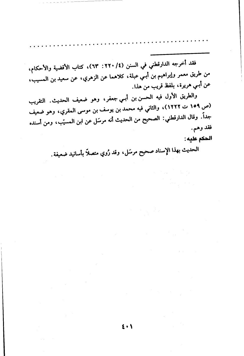 = فقد أخرجه الدارقطني في السنن (4/ 220: 63)، كتاب الأقضية والأحكام، من طريق معمر وإبراهيم بن أبي عبلة، كلاهما عَنِ الزُّهْرِيِّ، عَنْ سَعِيدِ بْنِ الْمُسَيِّبِ، عَنْ أبي هريرة، بلفظ قريب من هذا.
