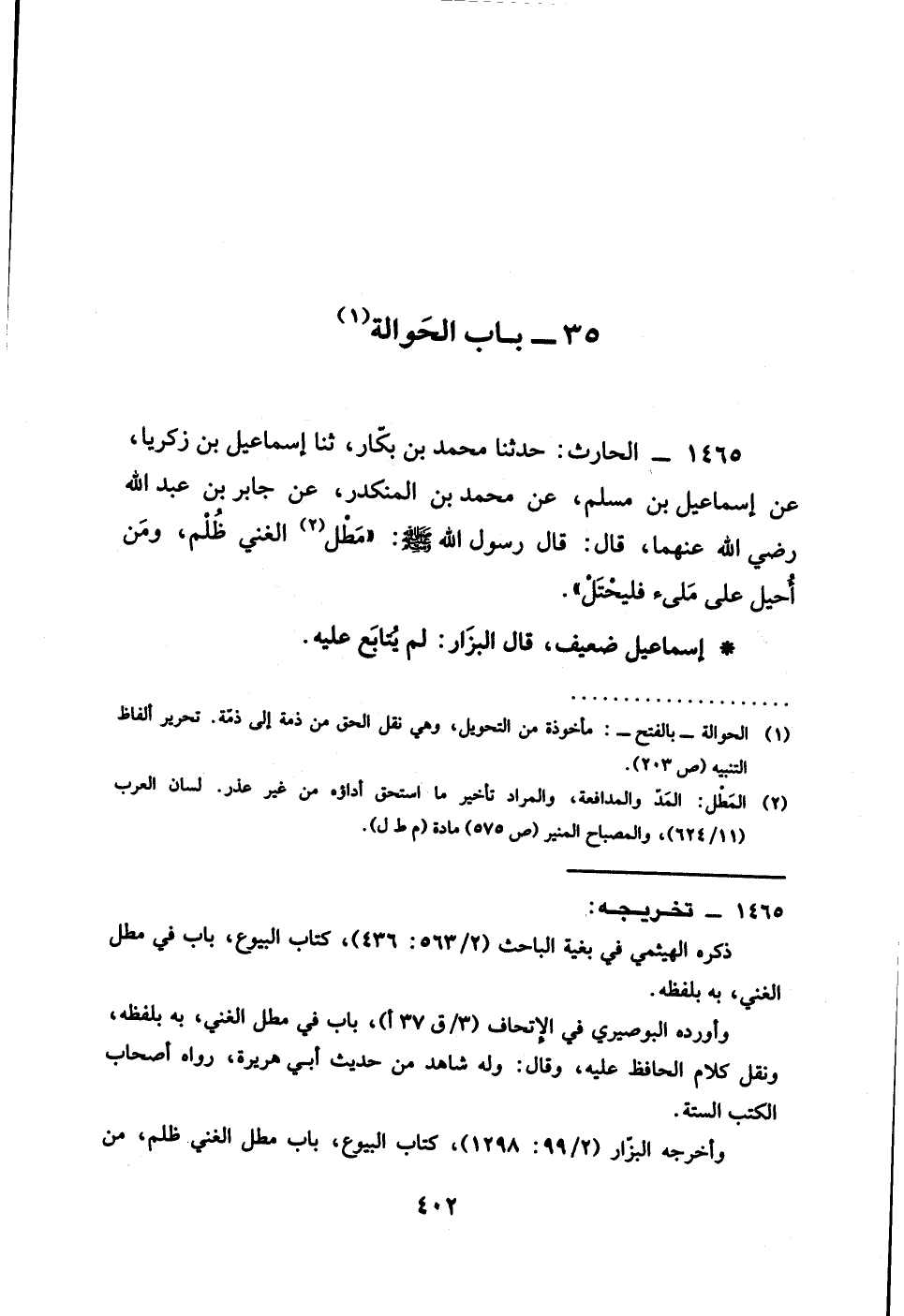 1465 - الْحَارِثُ حَدَّثَنَا مُحَمَّدُ بْنُ بَكَّارٍ ثنا إِسْمَاعِيلُ بْنُ زَكَرِيَّا عَنْ إِسْمَاعِيلَ بْنِ مُسْلِمٍ عَنْ مُحَمَّدِ بْنِ الْمُنْكَدِرِ عَنْ جَابِرِ بْنِ عبد الله رَضِيَ الله عَنْهما قَالَ قَالَ رَسُولُ اللَّهِ صَلَّى اللَّهُ عَلَيْهِ وَسَلَّمَ §مَطْلُ الْغَنِيِّ ظلم ومن أحيل على ملئ فَلْيَحْتَلْ