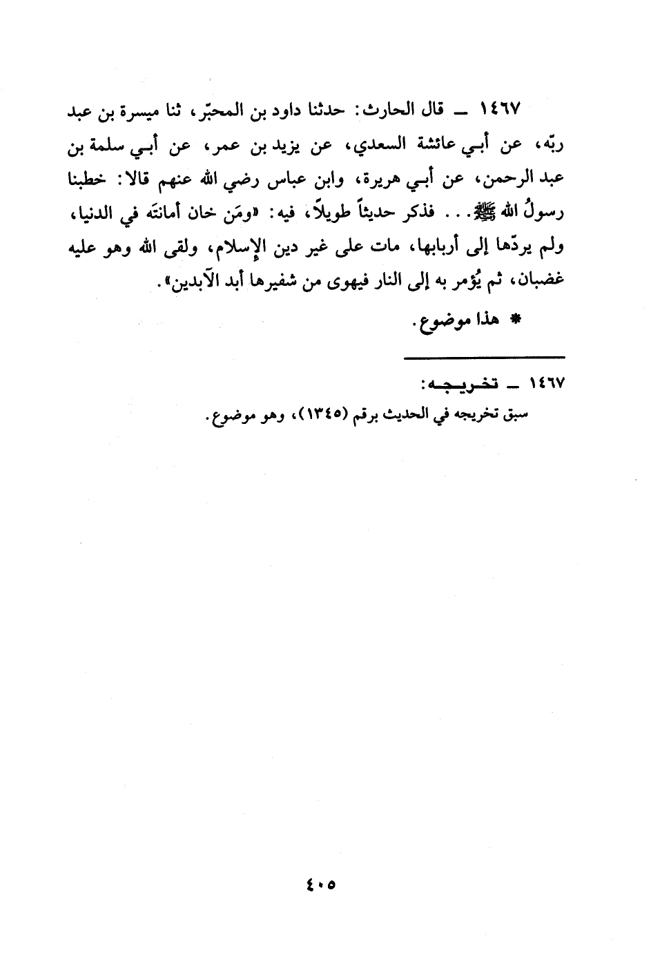 1467 - قال الْحَارِثُ حَدَّثَنَا دَاوُدُ بْنُ الْمُحَبَّرِ ثنا مَيْسَرَةُ بْنُ عَبْدِ رَبِّهِ عَنْ أَبِي عَائِشَةَ السَّعْدِيِّ عَنْ يزيد بن عمر عَنْ أَبِي سَلَمَةَ بْنِ عَبْدِ الرَّحْمَنِ عَنْ أَبِي هُرَيْرَةَ وابن عباس رَضِيَ الله عَنْهم قَالَا خَطَبَنَا رَسُولُ اللَّهِ صَلَّى اللَّهُ عَلَيْهِ وَسَلَّمَ فَذَكَرَ حَدِيثًا طَوِيلًا فِيهِ §وَمَنْ خَانَ أَمَانَتَهُ فِي الدُّنْيَا وَلَمْ يَرُدَّهَا إِلَى أَرْبَابِهَا مَاتَ عَلَى غَيْرِ دِينِ الْإِسْلَامِ وَلَقِيَ اللَّهَ وَهُوَ عَلَيْهِ غَضْبَانُ ثُمَّ يُؤْمَرُ إِلَى النَّارِ فَيَهْوِي مِنْ شفيرها أَبَدَ الْآبِدِينَ