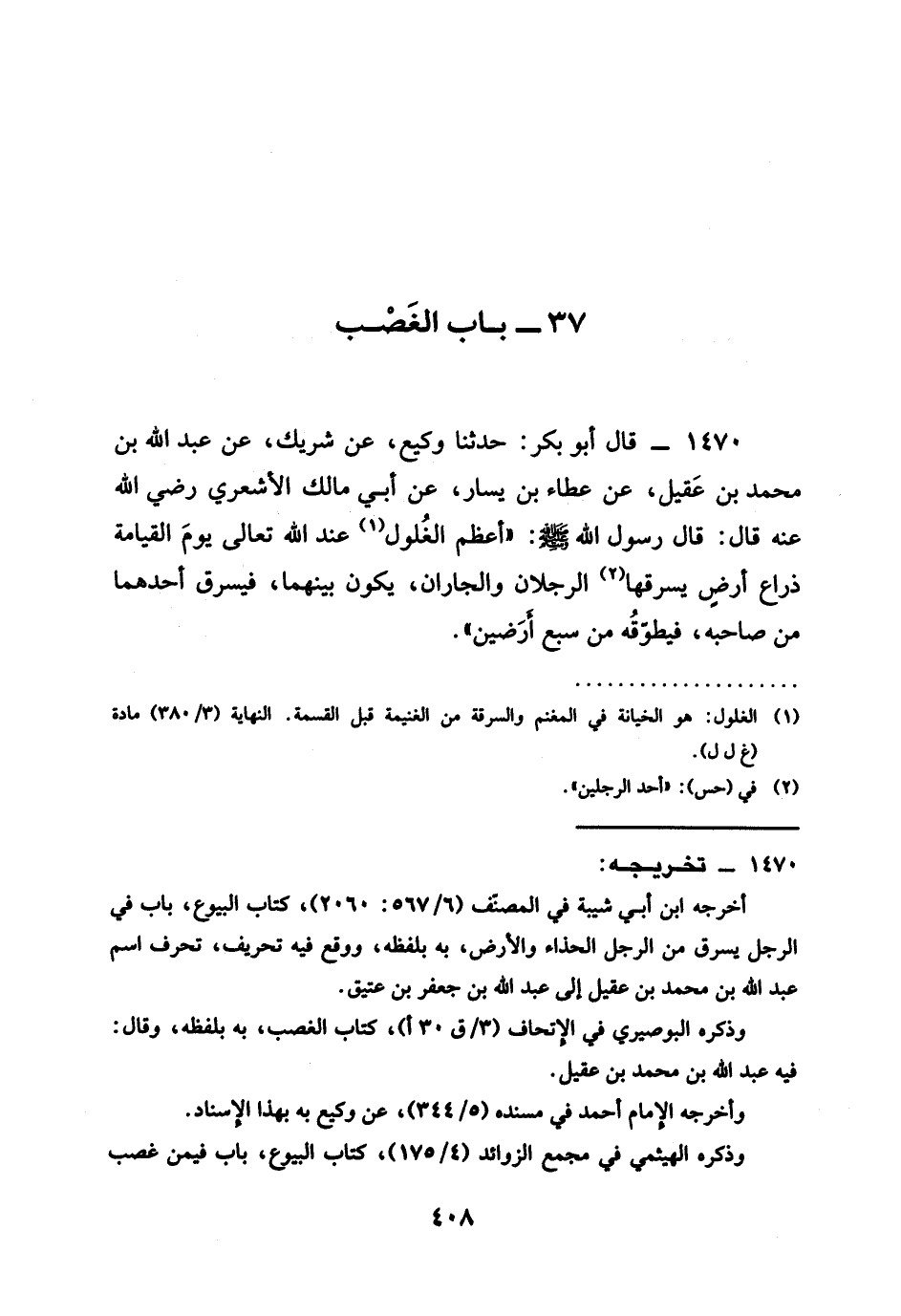 1470 - قَالَ أَبُو بَكْرٍ حَدَّثَنَا وَكِيعٌ عَنْ شَرِيكٍ عَنْ عَبْدِ اللَّهِ بْنِ مُحَمَّدِ بْنِ عَقِيلٍ عَنْ عَطَاءِ بْنِ يَسَارٍ عَنْ أَبِي مالك الأشعري رَضِيَ الله عَنْه قَالَ قَالَ رَسُولُ اللَّهِ صَلَّى اللَّهُ عَلَيْهِ وَسَلَّمَ §أَعْظَمُ الْغُلُولِ عند الله تعالى يَوْمَ الْقِيَامَةِ ذِرَاعُ أَرْضٍ يَسْرِقُهَا الرَّجُلَانِ وَالْجَارَانِ يكون بينهما فيسرق أَحَدُهُمَا مِنْ صَاحِبِهِ فَيُطَوَّقُهُ مِنْ سَبْعِ أَرَضِينَ