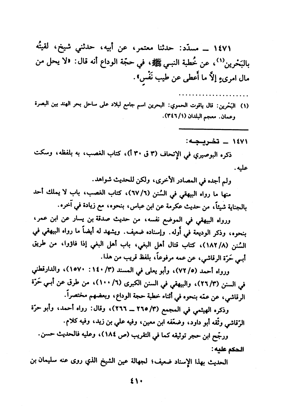 1471 - مُسَدَّدٌ حَدَّثَنَا مُعْتَمِرٌ عَنْ أَبِيهِ حَدَّثَنِي شَيْخٌ لَقِيتُهُ بِالْبَحْرَيْنِ عَنْ خُطْبَةِ النَّبِيِّ صَلَّى اللَّهُ عَلَيْهِ وَسَلَّمَ فِي حَجَّةِ الْوَدَاعِ أَنَّهُ قَالَ §لَا يَحِلُّ مِنْ مَالِ امْرِئٍ إِلَّا مَا أَعْطَى عن طيب نفس