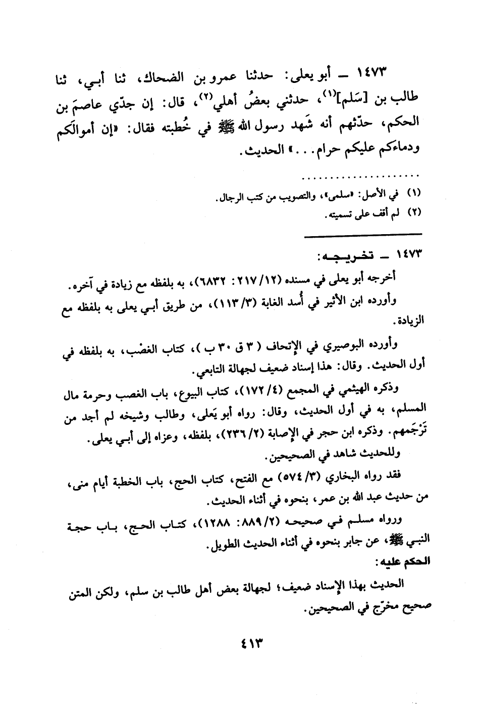 1473 - أَبُو يَعْلَى حَدَّثَنَا عَمْرُو بْنُ الضَّحَّاكِ ثنا أَبِي ثنا طالب بن سلم حَدَّثَنِي بعض أهلي قال أَنَّ جَدِّي عَاصِمَ بن الحكم حدثهم أَنَّهُ شَهِدَ رَسُولَ اللَّهِ صَلَّى اللَّهُ عَلَيْهِ وَسَلَّمَ فِي خُطْبَتِهِ فَقَالَ إِنَّ §أَمْوَالَكُمْ وَدِمَاءَكُمْ عَلَيْكُمْ حَرَامٌ الْحَدِيثَ