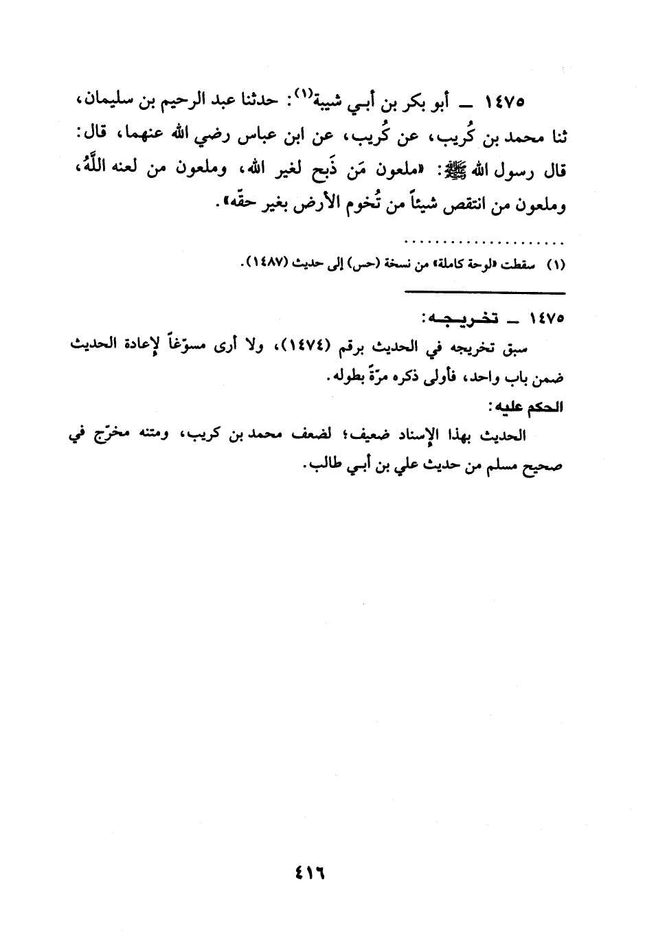 1475 - أبو بكر بن أبي شيبة حدثنا عبد الرحيم بن سليمان ثنا محمد بن كريب عن كريب عن ابن عباس رَضِيَ الله عَنْهما قال قال رسول الله صَلَّى اللَّهُ عَلَيْهِ وَسَلَّمَ ملعون من ذبح لغير الله وملعون من لعنه الله وملعون من انتقص شيئا من تخوم الأرض بغير حقه