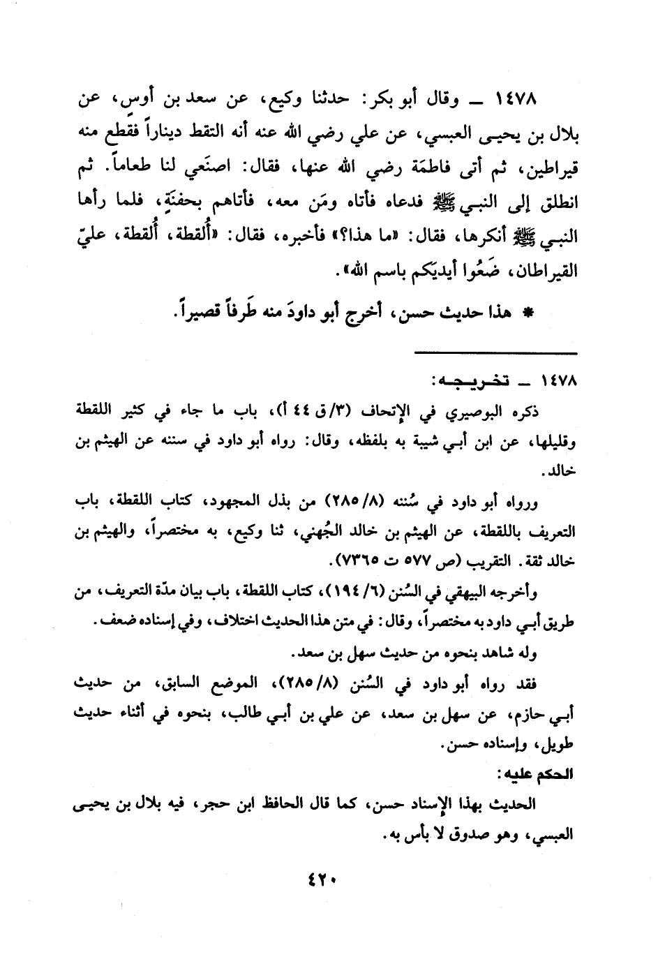 1478 - وَقَالَ أَبُو بَكْرِ حَدَّثَنَا وكيع عن سعد بْنِ أَوْسٍ عَنْ بِلَالِ بن يحيى العبسي عن علي رَضِيَ الله عَنْه أَنَّهُ الْتَقَطَ دِينَارًا فَقَطَعَ مِنْهُ قِيرَاطَيْنِ ثُمَّ أتى فاطمة رَضِيَ الله عَنْها فَقَالَ اصْنَعِي لَنَا طَعَامًا ثُمَّ انْطَلَقَ إِلَى النَّبِيِّ صَلَّى اللَّهُ عَلَيْهِ وَسَلَّمَ فَدَعَاهُ فَأَتَاهُ وَمَنْ مَعَهُ فَأَتَاهُمْ بِحَفْنَةٍ فَلَمَّا رَآهَا النَّبِيُّ صَلَّى اللَّهُ عَلَيْهِ وَسَلَّمَ أَنْكَرَهَا فَقَالَ مَا هَذَا فَأَخْبَرَهُ فَقَالَ أَلُقَطَةٌ أَلُقَطَةٌ عَلَيَّ الْقِيرَاطَانِ §ضعوا أيديكم باسم اللَّهِ