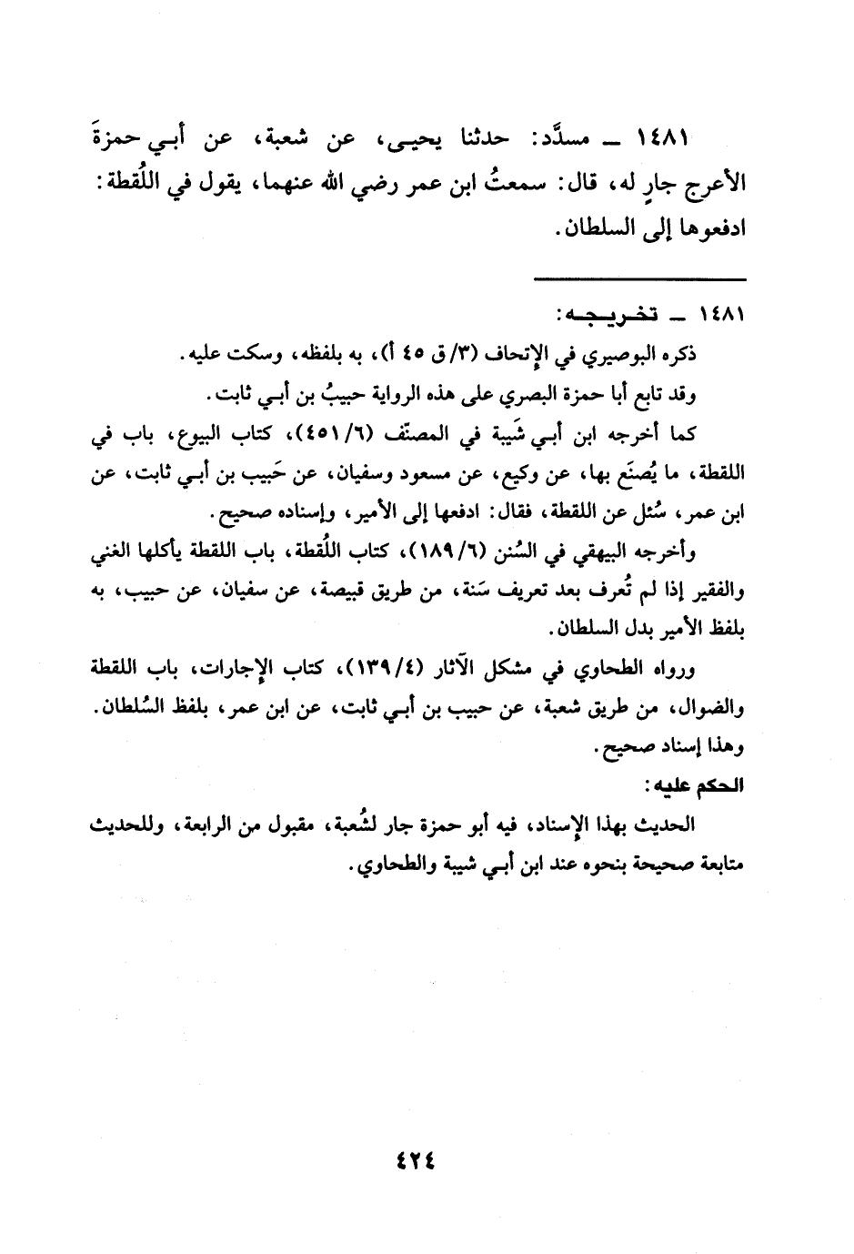 1481 - مُسَدَّدٌ حَدَّثَنَا يَحْيَى عَنْ شُعْبَةَ عَنْ أَبِي حَمْزَةَ الْأَعْرَجِ جار له قال سَمِعْتُ ابن عمر رَضِيَ الله عَنْهما يَقُولُ فِي اللُّقَطَةِ §ادْفَعُوهَا إِلَى السُّلْطَانِ