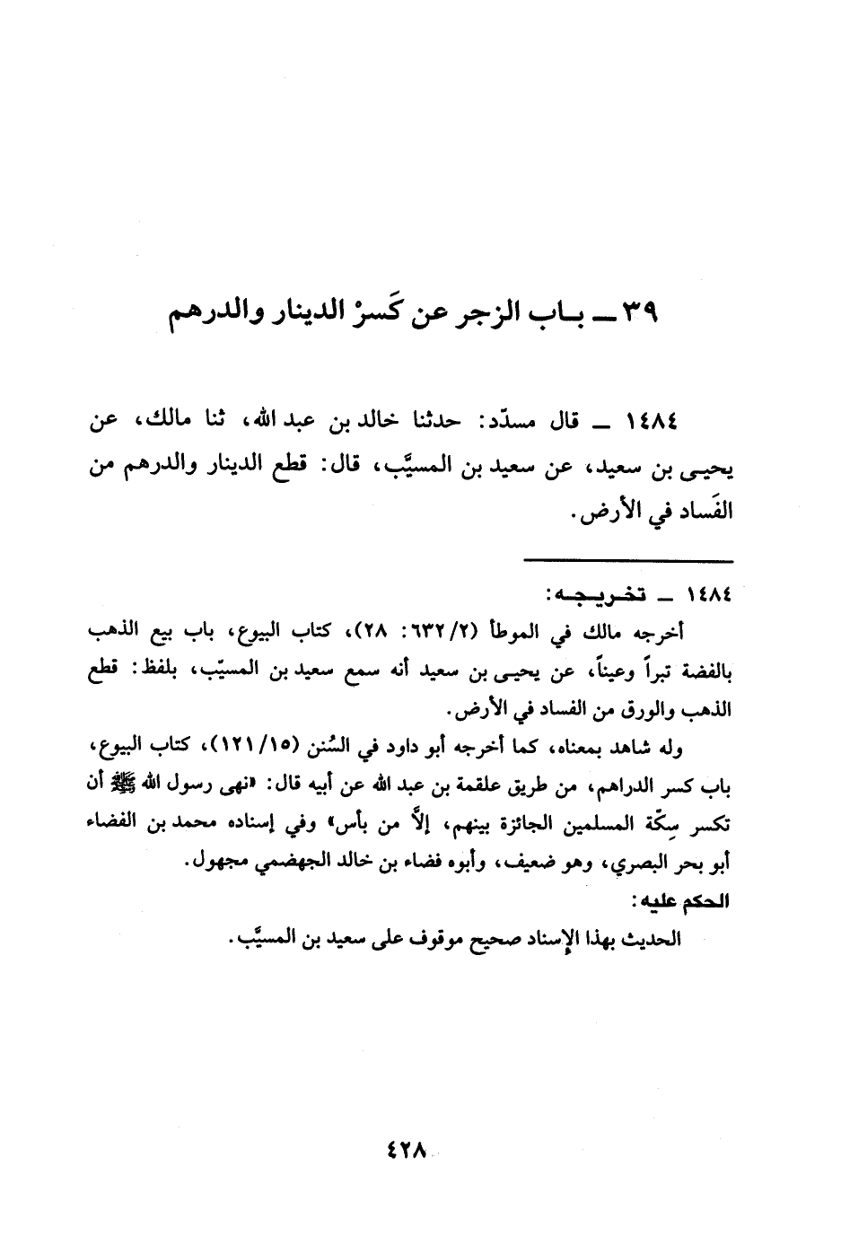 1484 - قَالَ مُسَدَّدٌ حَدَّثَنَا خَالِدُ بْنُ عَبْدِ اللَّهِ ثنا مَالِكٌ عَنْ يَحْيَى بْنِ سَعِيدٍ عَنْ سَعِيدِ بْنِ الْمُسَيِّبِ قَالَ §قَطْعُ الدِّينَارِ وَالدِّرْهَمِ مِنَ الْفَسَادِ فِي الْأَرْضِ
