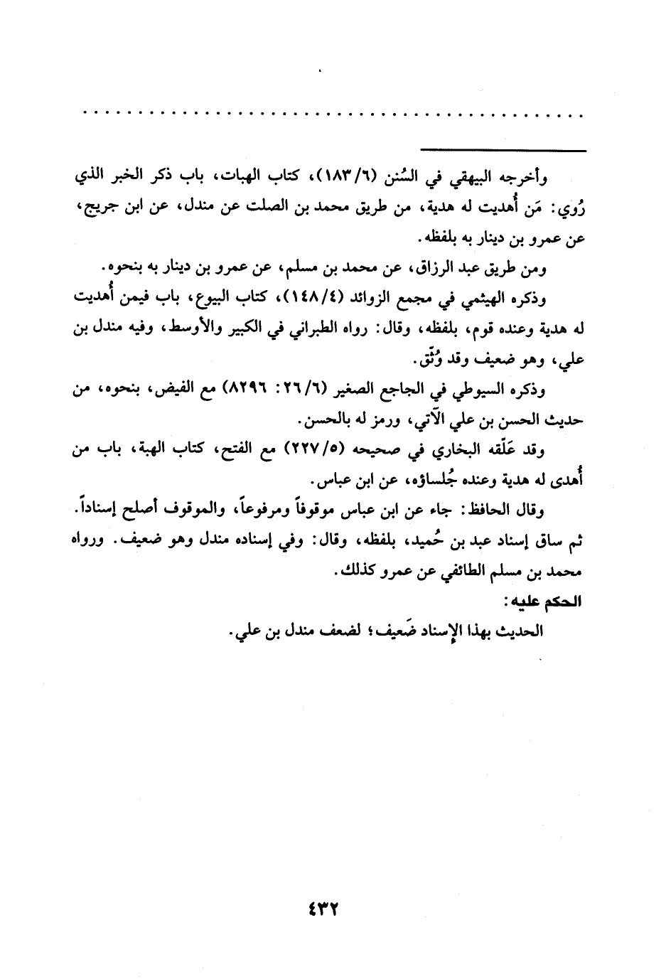 وذكره الهيثمي في مجمع الزوائد (4/ 148)، كتاب البيوع، باب فيمن أُهديت له هدية وعنده قوم، بلفظه، وقال: رواه الطبراني في الكبير والأوسط , وفيه مندل بن علي، وهو ضعيف وقد وُثّق.