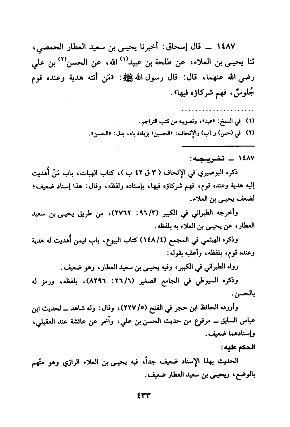 1487 - قال إِسْحَاقُ أَخْبَرَنَا يَحْيَى بْنُ سَعِيدٍ العطار الحمصبي ثنا يَحْيَى بْنُ الْعَلَاءِ عَنْ طَلْحَةَ بْنِ عبيد اللَّهِ عَنِ الحسن بْنِ عَلِيٍّ رَضِيَ الله عَنْهما قَالَ قَالَ رَسُولُ اللَّهِ صَلَّى اللَّهُ عَلَيْهِ وَسَلَّمَ §مَنْ أَتَتْهُ هَدِيَّةٌ وَعِنْدَهُ قَوْمٌ جُلُوسٌ فَهُمْ شُرَكَاؤُهُ فِيهَا
