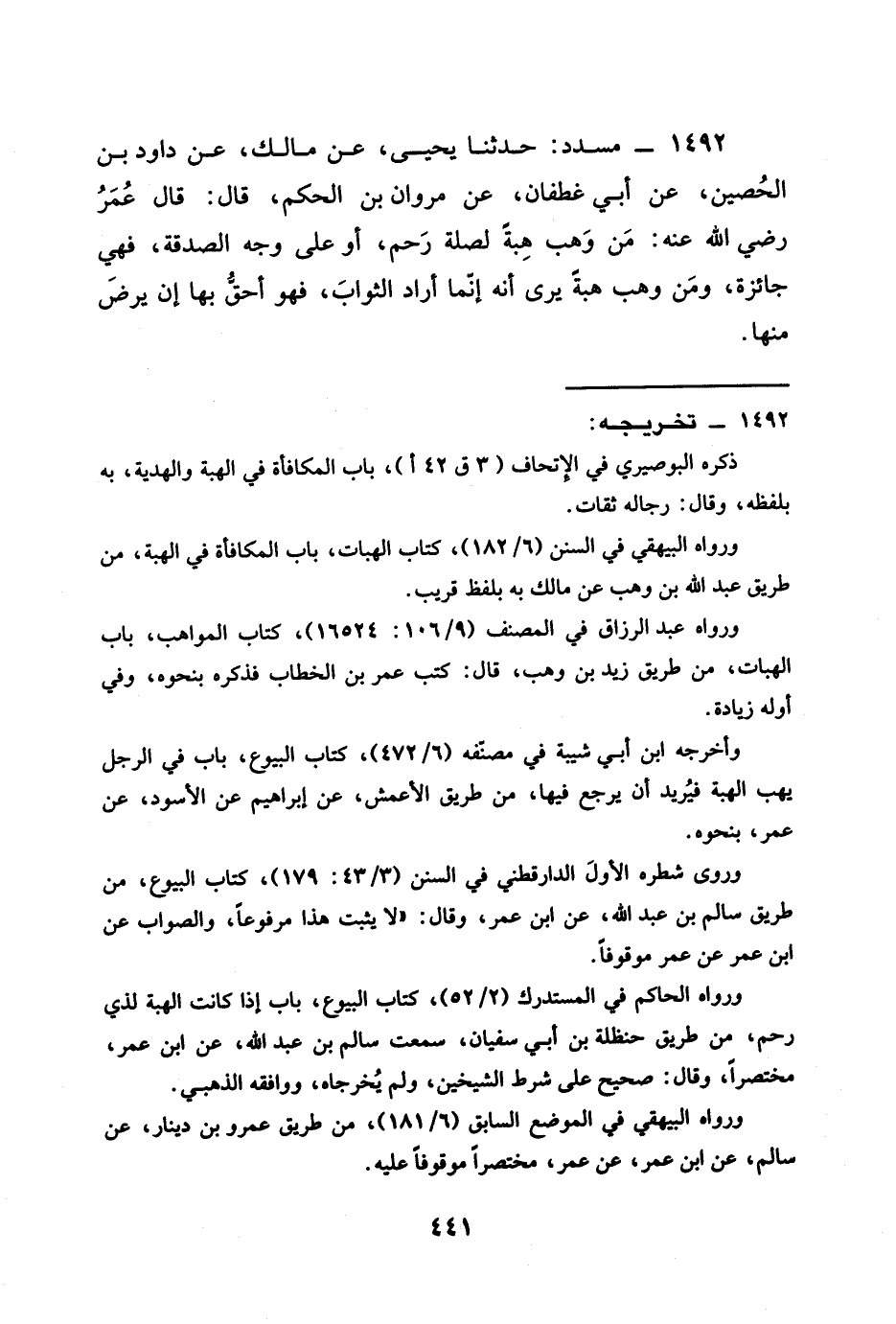 1492 - مُسَدَّدٌ حَدَّثَنَا يَحْيَى عَنْ مَالِكٍ عَنْ دَاوُدَ بْنِ الْحُصَيْنِ عَنْ أَبِي غَطَفَانَ عَنْ مَرْوَانَ بْنِ الْحَكَمِ قَالَ قال عمر رَضِيَ الله عَنْه §مَنْ وهب هبة لِصِلَةِ رحم أو على وَجْهِ الصَّدَقَةِ فَهِيَ جَائِزَةٌ وَمَنْ وَهَبَ هبة يَرَى أَنَّهُ إِنَّمَا أَرَادَ الثَّوَابَ فَهُوَ أَحَقُّ بِهَا إِنْ يُرْضَ مِنْهَا