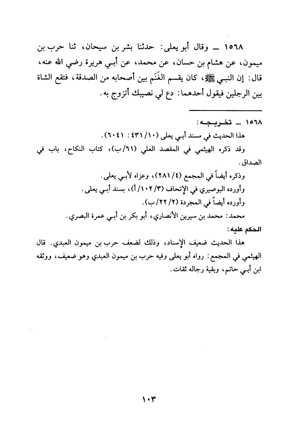 1568 - وَقَالَ أَبُو يَعْلَى حَدَّثَنَا بِشْرُ بْنُ سَيْحَانَ ثنا حَرْبُ بْنُ مَيْمُونٍ عَنْ هِشَامِ بْنِ حَسَّانَ عَنْ مُحَمَّدٍ عَنْ أبي هريرة رَضِيَ الله عَنْه قال إن النبي صَلَّى اللَّهُ عَلَيْهِ وَسَلَّمَ أيان §يَقْسِمُ الْغَنْمَ بَيْنَ أَصْحَابِهِ مِنَ الصَّدَقَةِ فتقع الشاة بي الرَّجُلَيْنِ فَيَقُولُ أَحَدُهُمَا دَعْ لِي يصيبك أَتَزَوَّجْ بِهِ