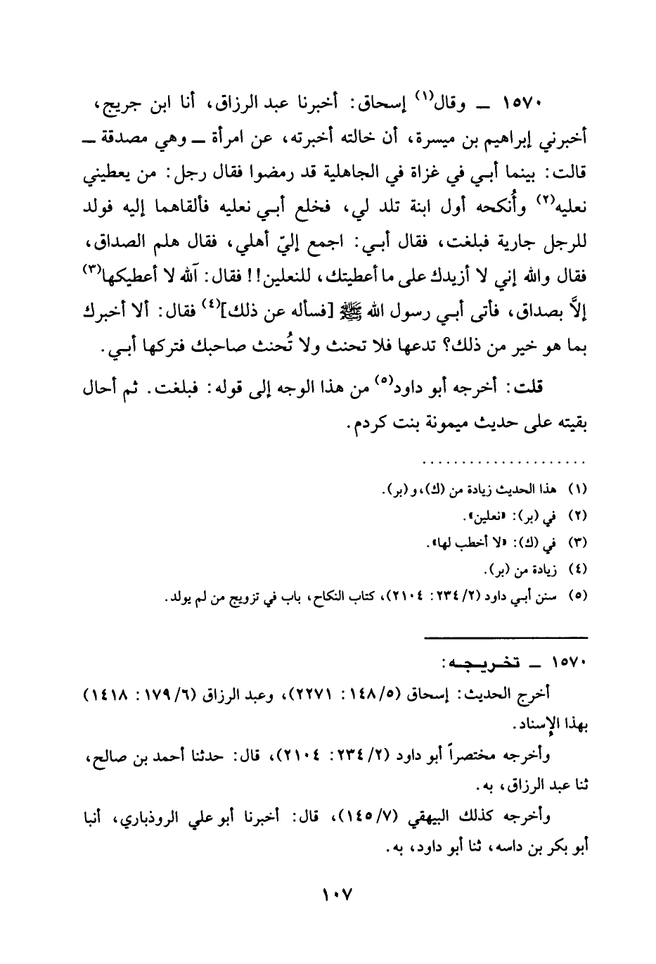1570 - وَقَالَ إِسْحَاقُ أَخْبَرَنَا عَبْدُ الرزاق أن بن جُرَيْجٍ أَخْبَرَنِي إِبْرَاهِيمُ بْنُ مَيْسَرَةَ أَنَّ خَالَتَهُ أَخْبَرَتْهُ عَنِ امْرَأَةٍ - وَهِيَ مُصَدَّقَةٌ قَالَتْ بَيْنَمَا أَبِي فِي غَزَاةٍ فِي الْجَاهِلِيَّةِ قَدْ رَمِضُوا فَقَالَ رَجُلٌ مَنْ يُعْطِينِي نَعْلَيْهِ أنكحه أَوَّلَ ابْنَةٍ تَلِدُ لِي فَخَلَعَ أَبِي نَعْلَيْهِ ألقاهما إِلَيْهِ فَوُلِدَ لِلرَّجُلِ جَارِيَةٌ فَبَلَغَتْ فَقَالَ أَبِي اجْمَعْ إِلَيَّ أَهْلِي فَقَالَ هَلُمَّ الصداق فقال والله إِنِّي لَا أَزِيدُكَ عَلَى مَا أَعْطَيْتُكَ لِلنَّعْلَيْنِ فَقَالَ الله لا أعطيكها إِلَّا بِصَدَاقٍ فَأَتَى أَبِي رَسُولَ اللَّهِ صَلَّى اللَّهُ عَلَيْهِ وَسَلَّمَ فَسَأَلَهُ عَنْ ذَلِكَ فَقَالَ §أَلَا أُخْبِرُكَ بما هو خير مِنْ ذَلِكَ تَدَعْهَا فَلَا تَحْنَثُ وَلَا تُحْنِثُ صَاحِبَكَ فَتَرَكَهَا أَبِي