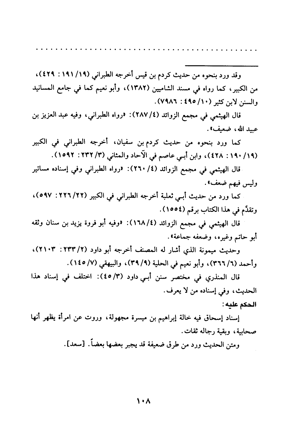 كما ورد بنحوه من حديث كردم بن سفيان، أخرجه الطبراني في الكبير (19/ 190: 428)، وابن أبي عاصم في الآحاد والمثاني (3/ 232: 1592).