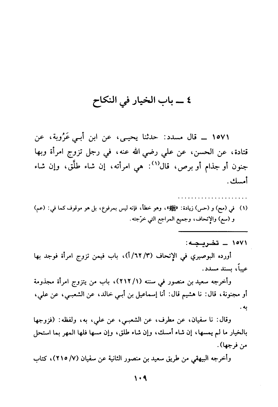 1571 - قَالَ مُسَدَّدٌ حَدَّثَنَا يَحْيَى عَنِ ابْنِ أَبِي عَرُوبَةَ عَنْ قَتَادَةَ عَنِ الْحَسَنِ عن علي رصي الله عنه فِي §رَجُلٍ تَزَوَّجَ امْرَأَةً وَبِهَا جُنُونٌ أَوْ جُذَامٌ أو برص قال هِيَ امْرَأَتُهُ إِنْ شَاءَ طَلَّقَ وَإِنْ شَاءَ أَمْسَكَ