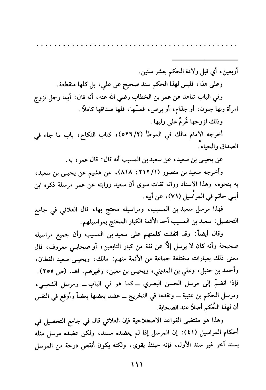 فهذا مرسل سعيد بن المسيب، ومراسيله محتج بها، قال العلائي في جامع التحصيل: سعيد بن المسيب أحد الأئمة الكبار المحتج بمراسيلهم.