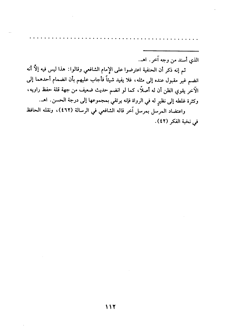 ثم إنه ذكر أن الحنفية اعترضوا على الإِمام الشافعي وقالوا: هذا ليس فيه إلَّا أنه انضم غير مقبول عنده إلى مثله، فلا يفيد شيئًا فأجاب عليهم بأن انضمام أحدهما إلى الآخر يقوي الظن أن له أصلًا، كما لو انضم حديث ضعيف من جهة قلة حفظ راويه، وكثرة غلطه إلى نظيرٍ له في الرواة فإنه يرتقي بمجموعها إلى درجة الحسن. اهـ.