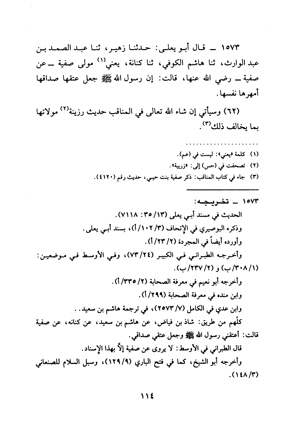 2573 - قال أَبُو يَعْلَى حَدَّثَنَا زُهَيْرٌ ثنا عَبْدُ الصَّمَدِ بْنُ عَبْدِ الْوَارِثِ ثنا هَاشِمٌ الْكُوفِيُّ ثنا كِنَانَةُ يَعْنِي مَوْلَى صَفِيَّةَ عن صفية رَضِيَ الله عَنْها قالت §أَنَّ رَسُولَ اللَّهِ صَلَّى اللَّهُ عَلَيْهِ وَسَلَّمَ جَعَلَ عِتْقَهَا صَدَاقَهَا أَمْهَرَهَا نَفْسَهَا